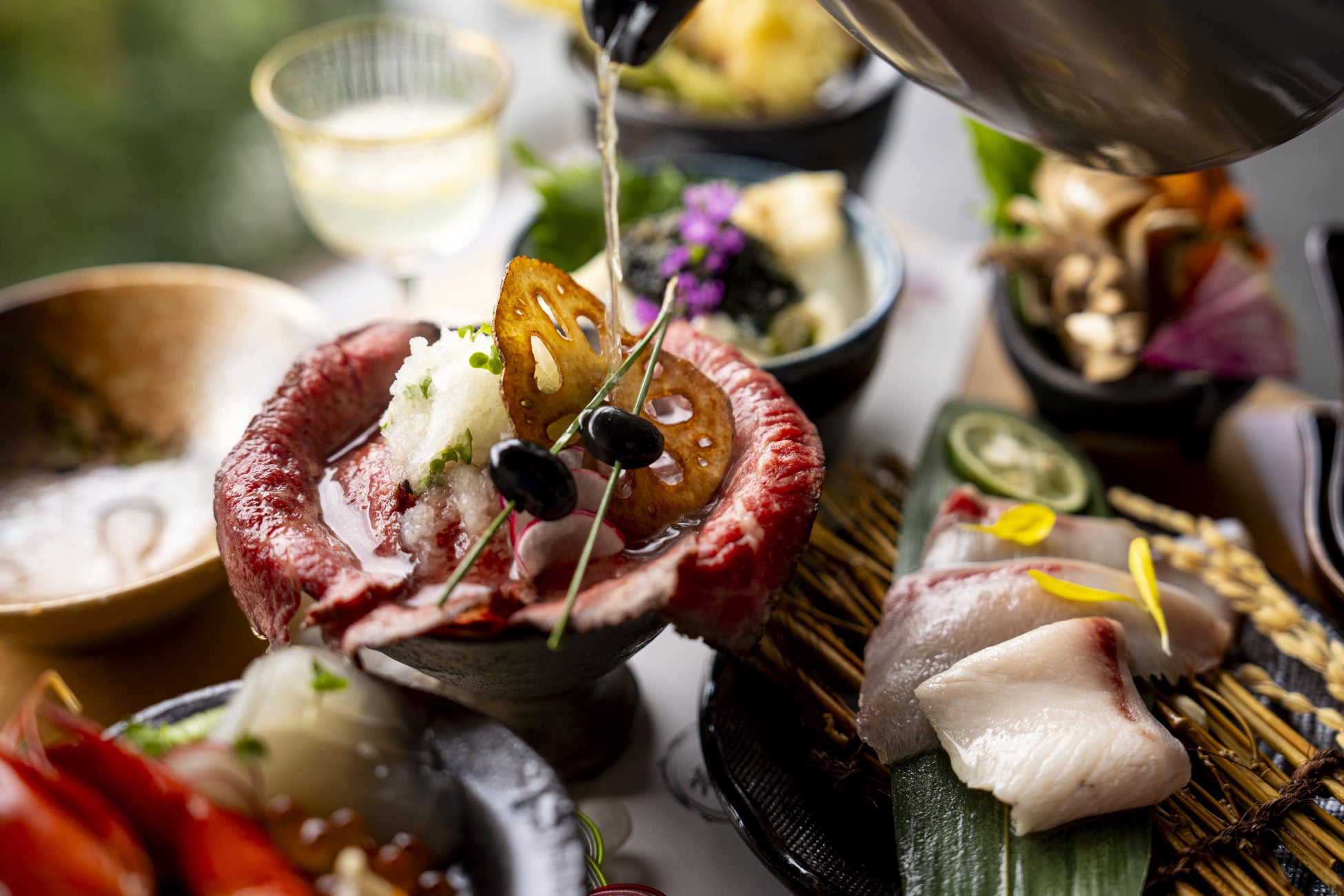 ただ“食べる”だけではなく、五感で体験しステキな思い出を作っていただきたいという想いを込めてメニューを考案しています。新鮮な食材の香りや食感、料理の盛り付けや食べ方を、五感で体験する新たな御膳をお召し上がりいただけます。