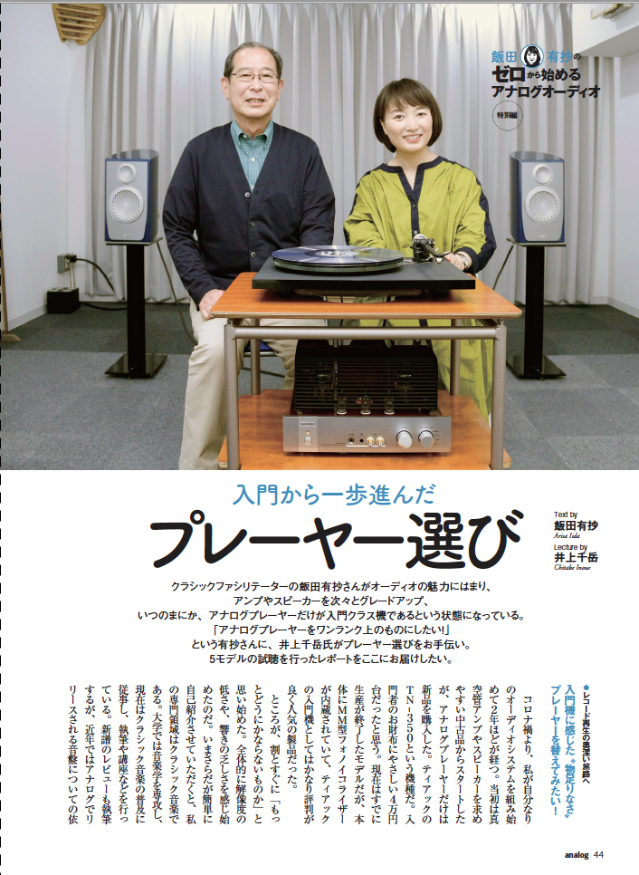 クラシックファシリテーターの飯田有抄さんがオーディオの魅力にはまり、アンプやスピーカーを次々とグレードアップ、いつのまにか、アナログプレーヤーだけが入門クラス機であるという状態になっています。「アナログプレーヤーをワンランク上のものにしたい!」という有抄さんに、井上千岳氏がプレーヤー選びをお手伝い。プレーヤー選びの指標、モデルの試聴を行った飯田有抄さん渾身のレポートをお届けします。