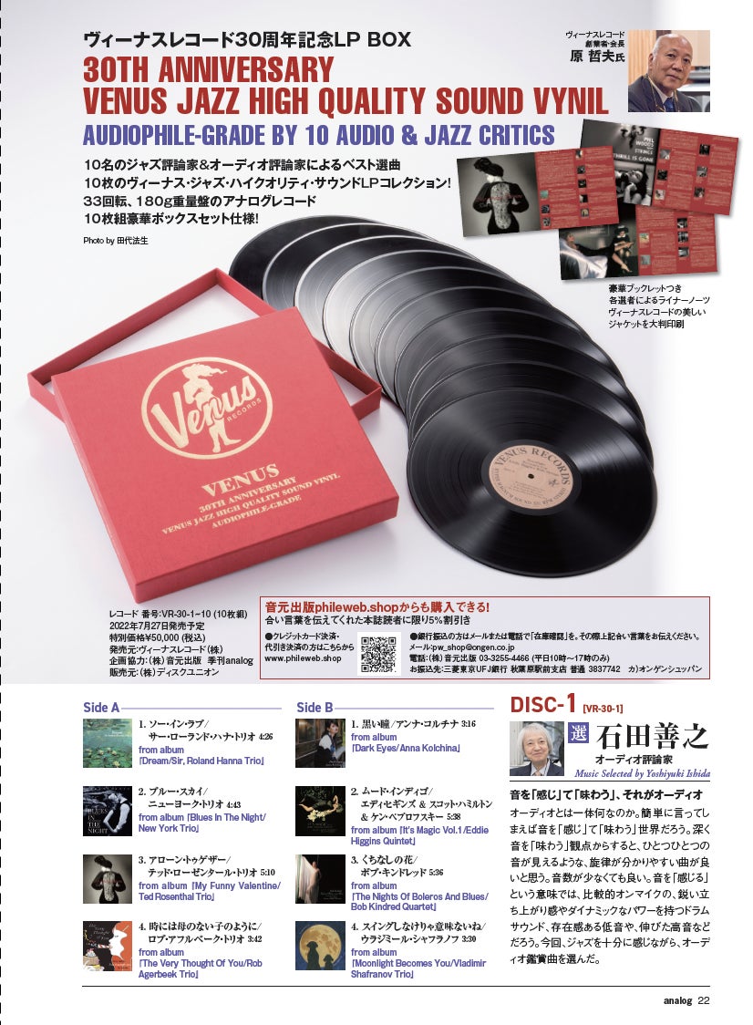 オーディオファンに人気のジャズレーベル「ヴィーナスレコード」が30周年を迎え、アナログ誌とのコラボレーションが実現しました。 1992年に原哲夫氏が設立し、日本にジャズのパラダイスを作り続けてきたこのレーベルの楽曲を、アナログ誌のジャズ評論家とオーディオ評論家10人が厳選して、10枚のLPに納めた豪華なボックスセットの発売が決定! 本誌に特別関連記事を掲載しています。
