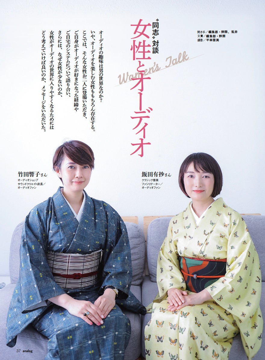 オーディオの趣味は男性の世界なのでしょうか? いや、オーディオを楽しむ女性ももちろん存在します。今回は、クラシックファシリテーターの飯田有抄さんと、サウンドクリエイト店長の竹田響子さんお二人にご登場いただき、ご自身がオーディオを好きになった経緯やご自宅のシステムについて語り合い、さらには、なぜ女性が少ないのか、女性がオーディオの世界に入りやすくなるにはどう考えていけば良いのか、メッセージをいただきました。対談の場には、お二人ともお着物をお召しになっていただいてご登場。「着物の趣味もオーディオに似ていますね」という、たおやかなお話をお楽しみください。