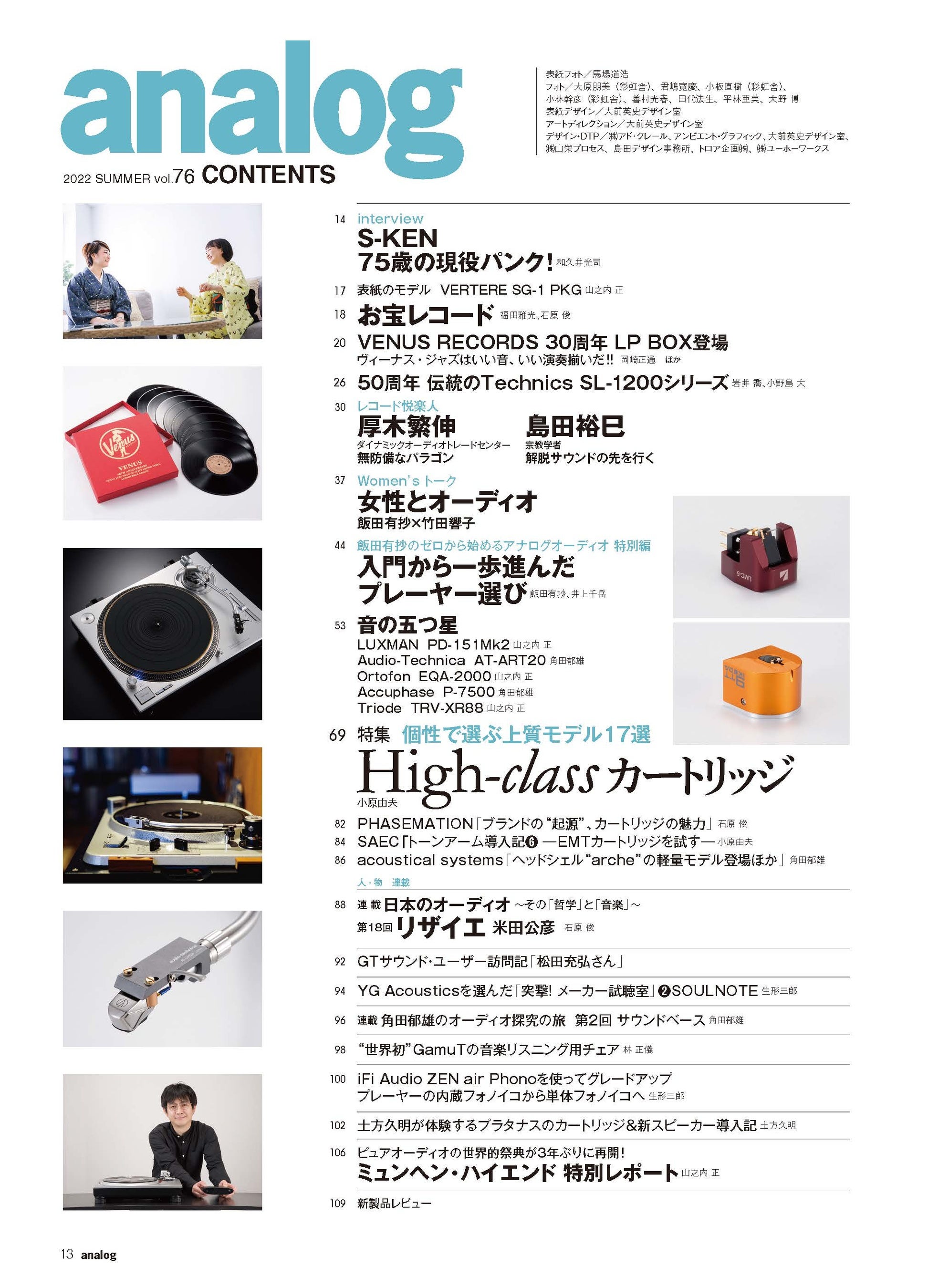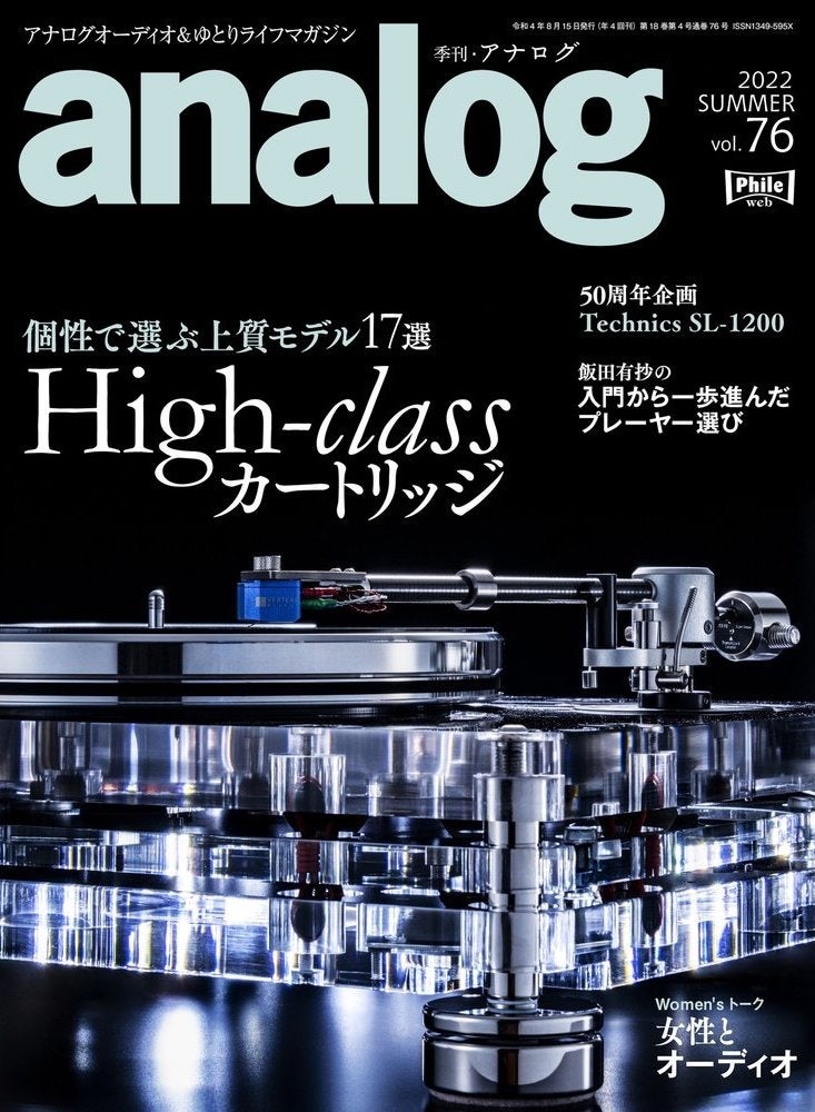 アナログオーディオと人と物にまつわる物語をオールカラーにてお届けする、国内唯一のアナログオーディオ専門誌「アナログ」最新号 Vol.76 2022 SUMMERは、本日7月4日(月)発売です。ピュアオーディオの世界ではマイノリティである女性オーディオ愛好家にフォーカスし、Women’sトーク「女性とオーディオ」「飯田有抄の入門から一歩進んだプレーヤー選び」を巻頭で展開、特集は一生モノとして使える「High-classカートリッジ17選」の一斉試聴を行いました。そのほか、ほかでは見られない読みごたえたっぷりの記事を満載しています。