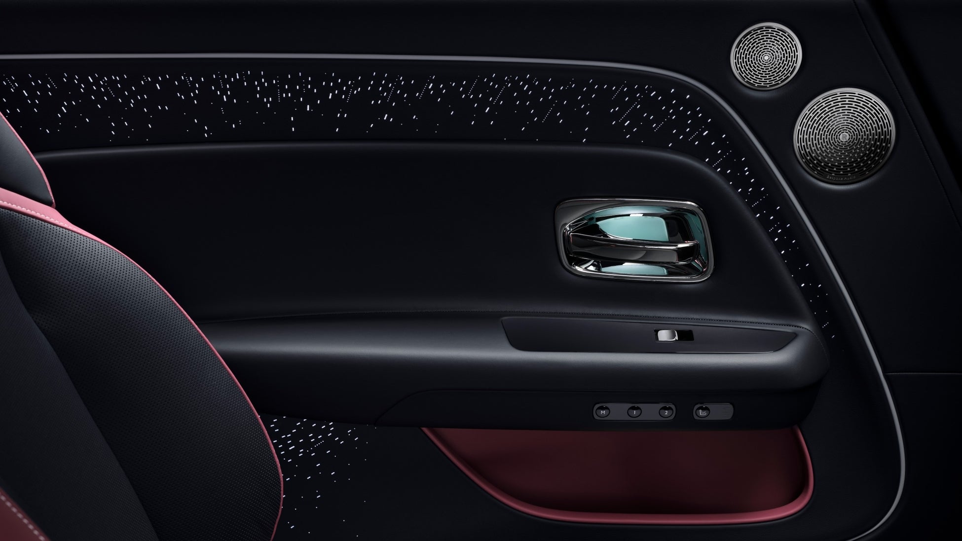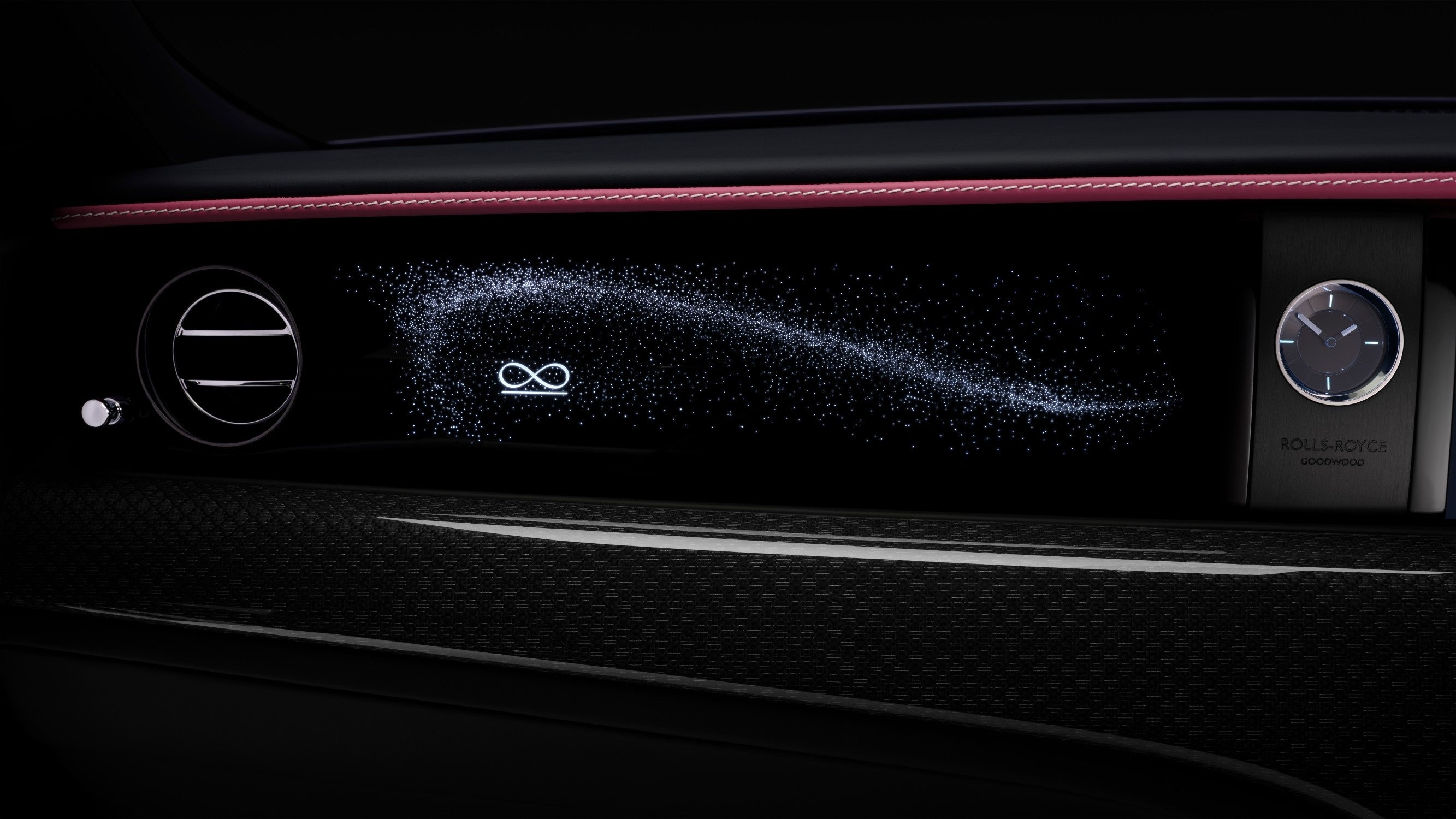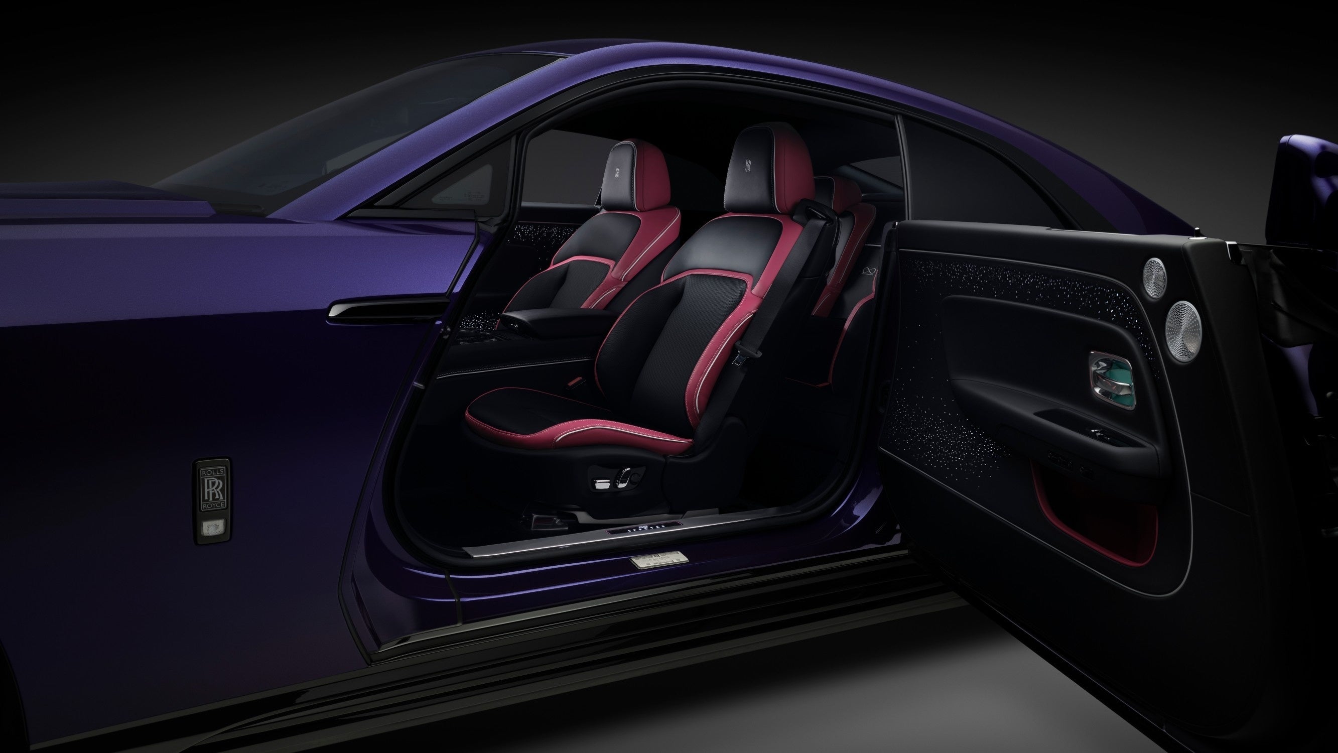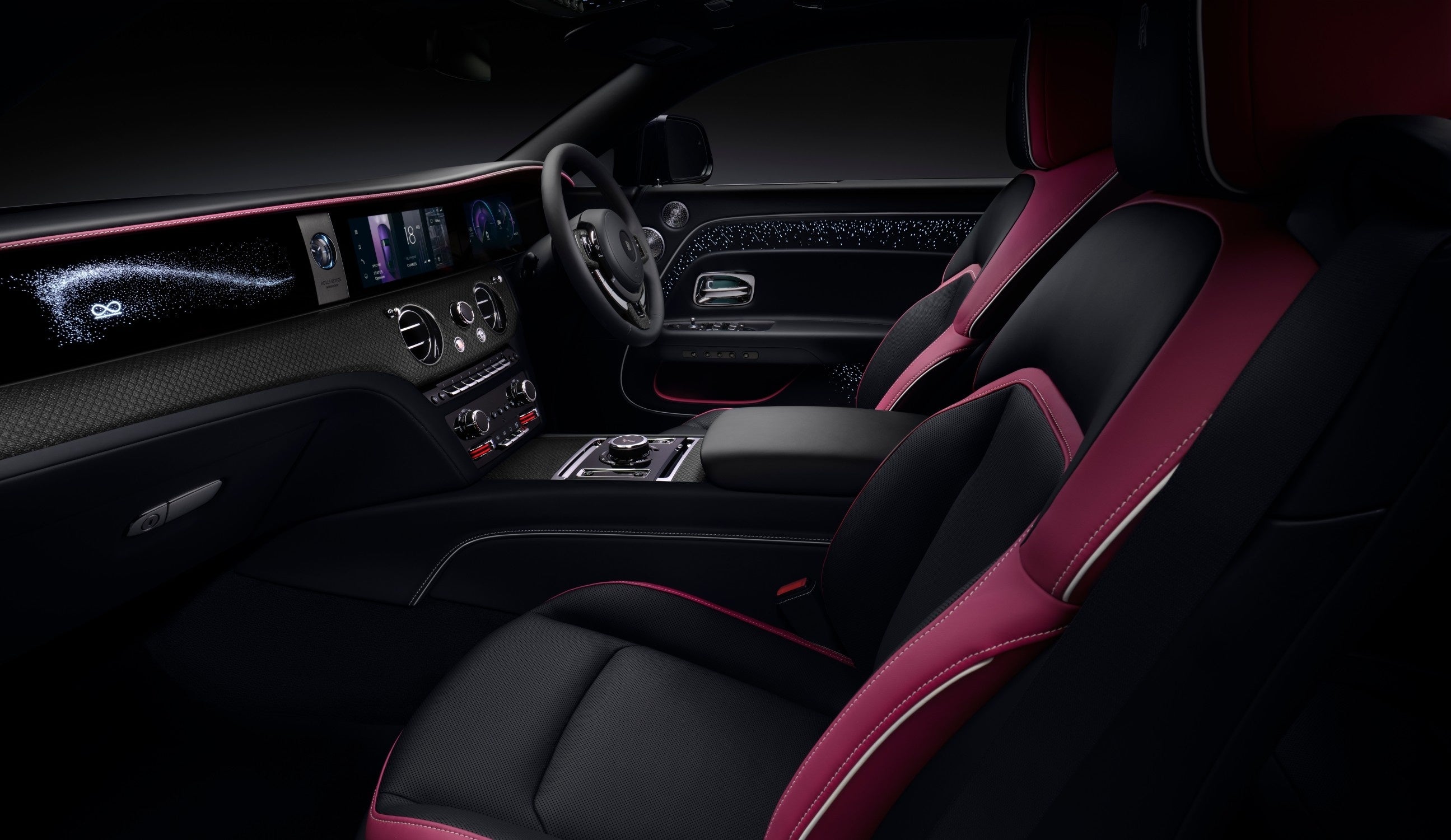 インテリアには、最先端の技術とクラフツマンシップを見事に表現した、ビスポークの可能性が印象的に仕上げられています。スピリット・オブ・エクスタシーを抽象的に解釈したイルミネーテッド・フェイシアには、ピアノ・ブラックの「空」に、ブラック・バッジを表すインフィニティ・シンボルが大小異なる輝きを放つ5,500個以上の「星」を散りばめたデザインで表現されています。