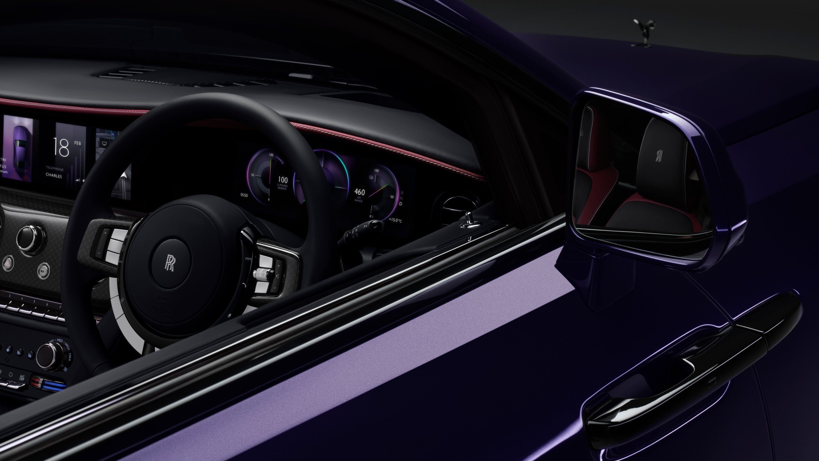 ブラック・バッジ・スペクターでは、パワートレインの技術革新により、圧倒的なパワーを瞬時に発揮するというコンセプトが徹底的に追求されています。ロールス・ロイスのブラック・バッジを象徴するインフィニティ・シンボルに敬意を表した、独自の「インフィニティ・モード」では、ステアリング・ホイールのインフィニティ・ボタン(∞)を押すことで、485 kW(659 hp)の最高出力が解放され、よりダイレクトなスロットル・レスポンスを実現します。このモードを有効にすると、走行状況の変化に連動して計器類の表示がより鮮やかに彩られます。
