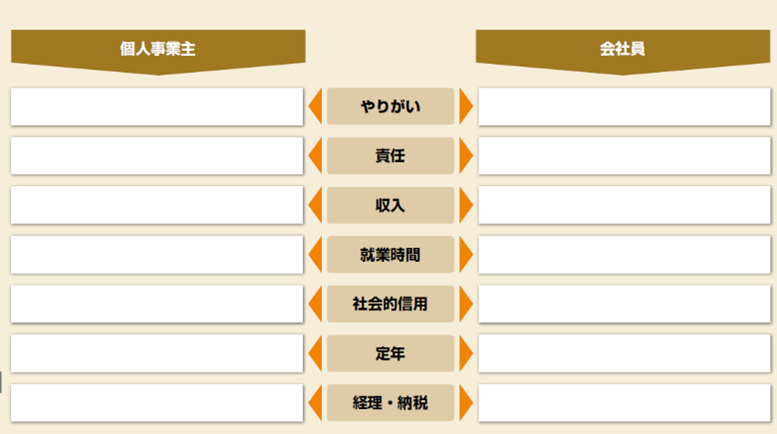 ▲ビジネスの持続可能性も考えられる創業計画書 ▲個人事業主と会社員の違いを考える