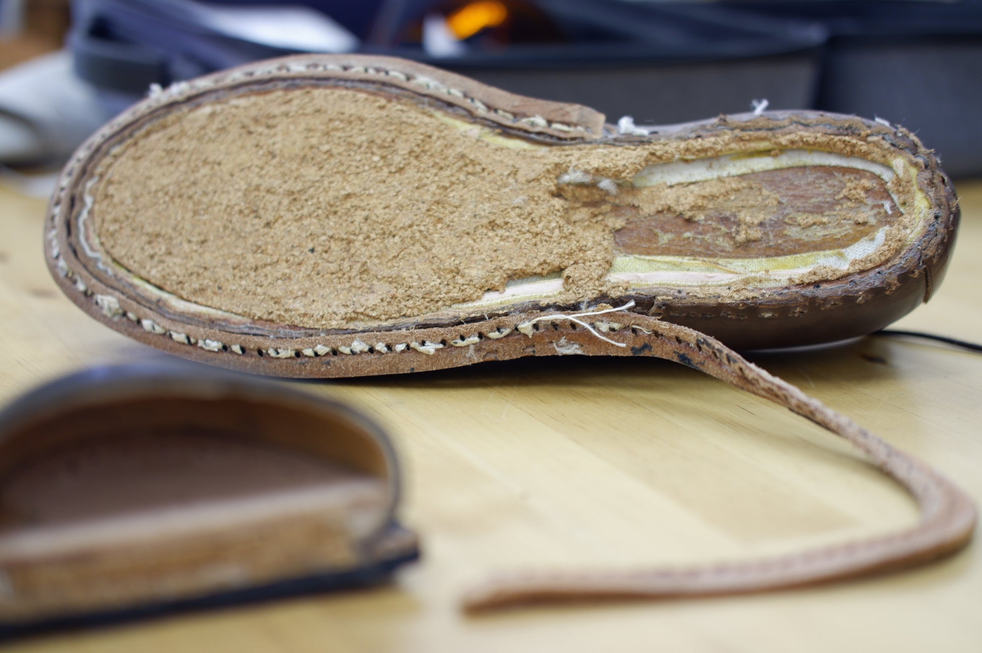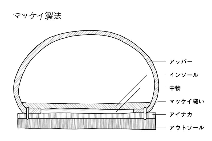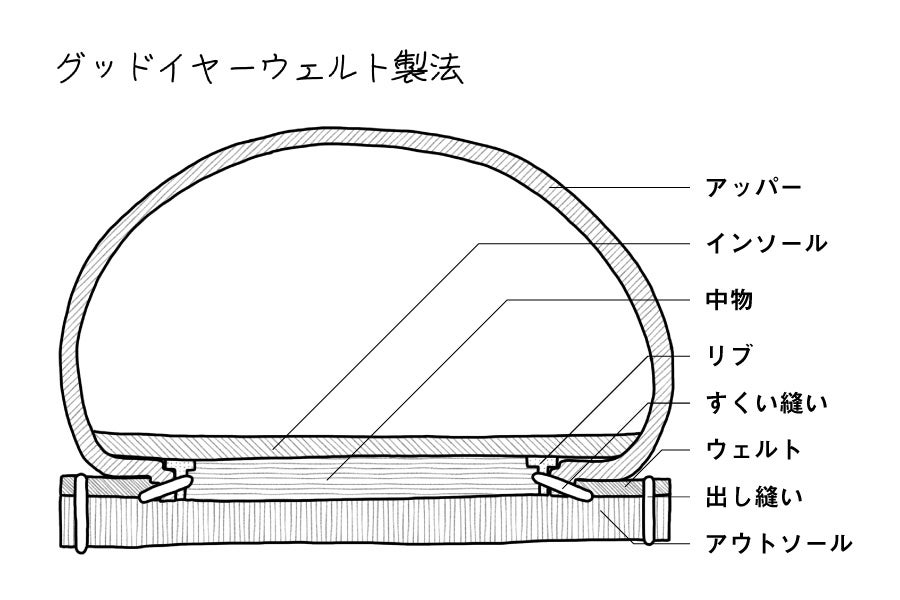 これらのユニットを「グッドイヤーウェルテッド製法」で仕立て上げます。この製法は靴の製法としては非常に質実剛健でソール交換も容易であり、 耐久性、耐水性にすぐれているのが特徴ですが、反面非常に手間暇がかかる製法で知られています。この製法はハンドメイドのオーダー靴や大手紳士靴ブランドのハイエンドモデルとして採用されていますが、機械では作れるところが本当に少なくなっています。