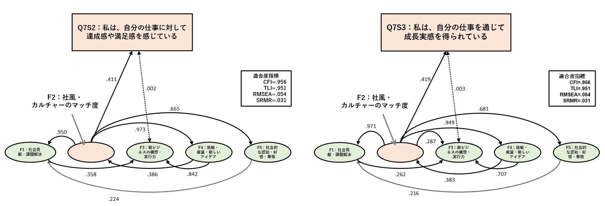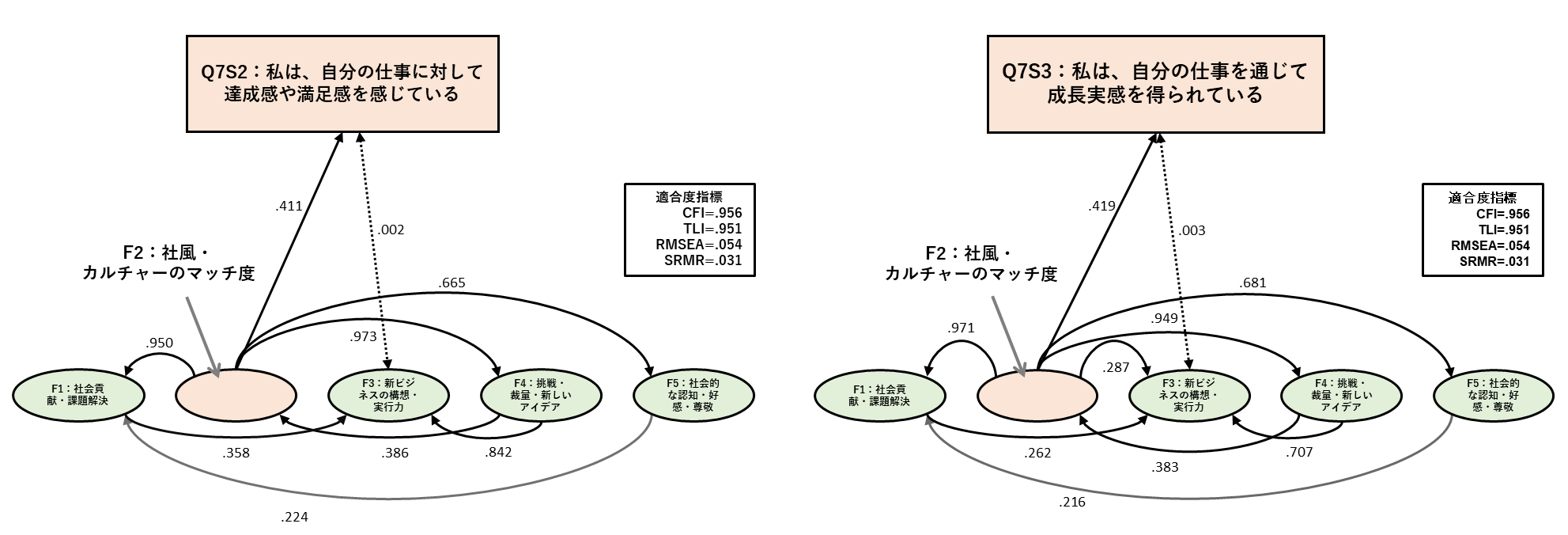 共分散構造分析(SEM)を行い、各因子がどのように仕事の達成感や満足感・成長実感と関係しているか明らかにしました。5つの因子の中で仕事の達成感や満足感・成長実感に最も寄与するのは、「社風・カルチャーのマッチ度」であることが分かりました。