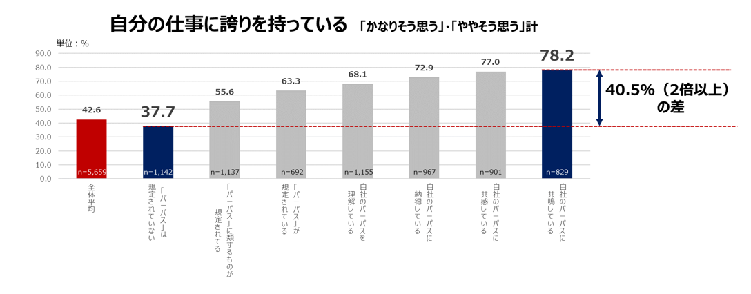 パーパス浸透深度と仕事への誇り(従業員エンゲージメント)の関係を見てみると、「自分の仕事に誇りを持っている」と回答した方の割合は、「パーパスに共鳴している」と回答した方では78.2%。「パーパスは規定されていない」と回答した方では37.7%でその差は2倍以上となりました。パーパスが規定されていることに加えて、心から同意できるパーパスであることが従業員の仕事に誇りにつながると考えられます。