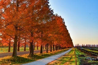 滋賀県のメタセコイア並木は、約500本のメタセコイアが約2.4kmにわたり、紅葉の時期には、「真っ赤」ではなく、「レンガ色」や「茶色」などと表現される美しさをご堪能いただけます。遠くに広がる野坂山地の山々と調和し、その美しさは読売新聞社の「新・日本街路樹百景」に選定されるほどです。