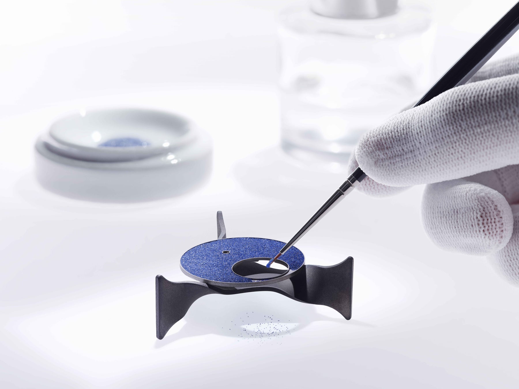 アベンチュリン・エナメルの技法は17世紀初頭まで遡ります。銅の細片が加わるガラスがまさに星空の印象をもたらすこの技法は、当時から絶えず改良されてきました。ブレゲはこの時計のためにグラン・フー エナメルのような作業を選びました。つまり、ガラスを粉末にするのです。最終的な組成には繊細にサイズを選ぶ必要があります。完璧な結果を生むためには、アベンチュリンの粉末が伝統的なエナメルの粉末よりもわずかに大きな粒子を持っていなくてはなりません。次にそれらを一緒にして摂氏800度以上の炉に入れ、この文字盤を最低でも5回連続して焼きます。1回ごとの焼成は極めて繊細です。時間が長すぎても、温度が高すぎても、満足のゆくような結果がまったく得られません。