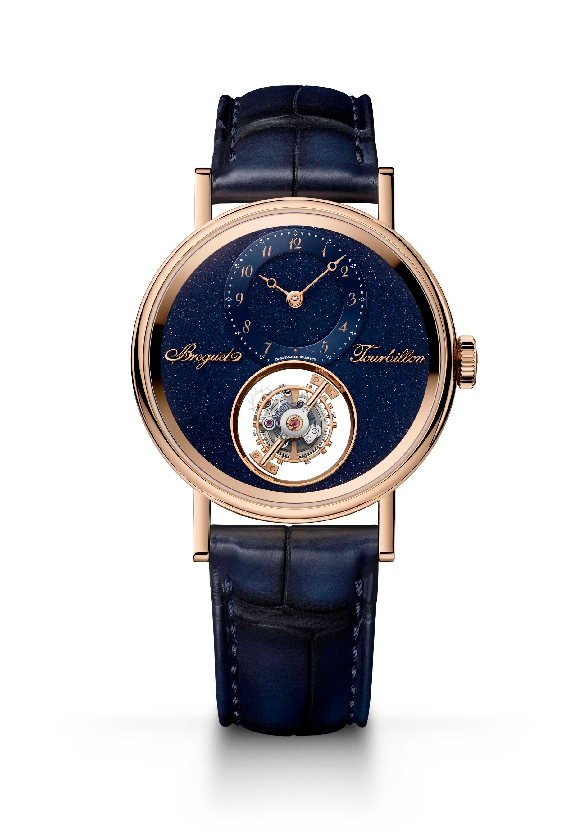 「クラシック トゥールビヨン シデラル 7255」は、こうした背景と結び付いており、新しい文字盤の装飾にブレゲ・マニュファクチュールでは初めてゴールドのベースに重ねたアベンチュリン・エナメルが用いられています。天文学や星空の観測に敬意を表したその深いブルーに散りばめられた銅の細片は、天空に輝く星を思わせます。