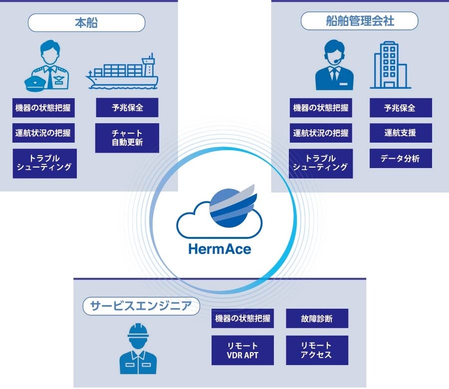 「HermAce」は、船舶に搭載した当社の航海機器や通信機器のデータをデジタルツイン(仮想空間に再現した複製)技術を用いてリアルタイムに陸上で収集・保存・監視するサービスです。本サービスにより、障害の原因を素早く把握し、具体的な解決手段に導くことができます。