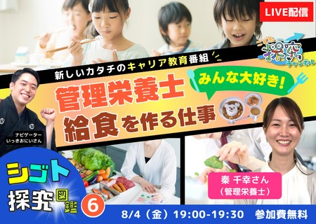 世の中にはいろいろなシゴト(職業)があります。各業界の第一線で活躍する方をゲストにお招きし、それぞれのおシゴトの現場を見せてもらう人気授業から、今回は給食を作る管理栄養士さんにフォーカス!シゴトをしていてどんな時に楽しい・大変だと思うのか、どうやったらその職業になれるのか、その職業は将来どうなっていくのか?など、身近な給食を基点に管理栄養士という職について、みんなの知りたいことに迫ります。