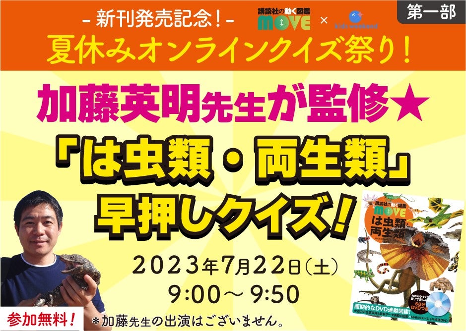 迫力のある写真やイラスト、またDVDによる動画を組み合わせた躍動感に夢中になる『講談社の動く図鑑MOVE』から、テレビでもおなじみの加藤 英明先生が監修したクイズを早押し形式で出題します。全国の生きものが好きな子どもたちが集まってクイズに熱中しながら、いきいきとしたビジュアル効果を楽しめます。参加者には加藤先生のサイン入り壁紙をプレゼント!また、MOVEクイズ祭り第二部では「講談社の動く図鑑MOVE 世界の探検」発売記念「世界のふしぎクイズ大会」を実施します。