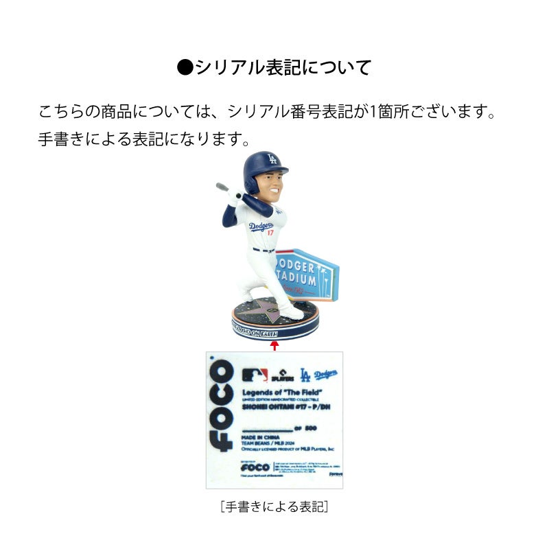 FOCO社製の大谷翔平選手 ドジャー・スタジアムバージョンのボブルヘッドです。スタジアムのイメージと細部までこだわったデザインが特徴です。本体サイズは高さ約19cm、化粧箱入りで、各商品にはシリアル番号が記されています。