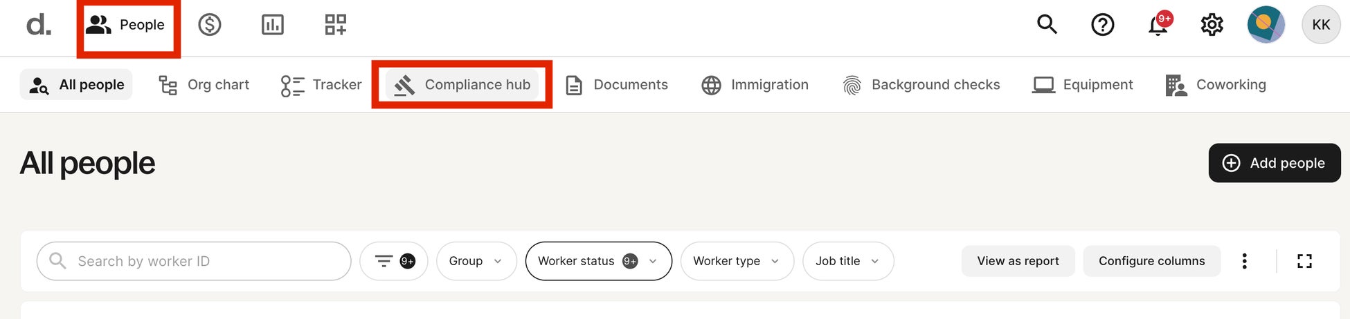 アカウント内上部の「People」をクリックし、「Compliance hub」を選択いただくとアクセスすることができます。