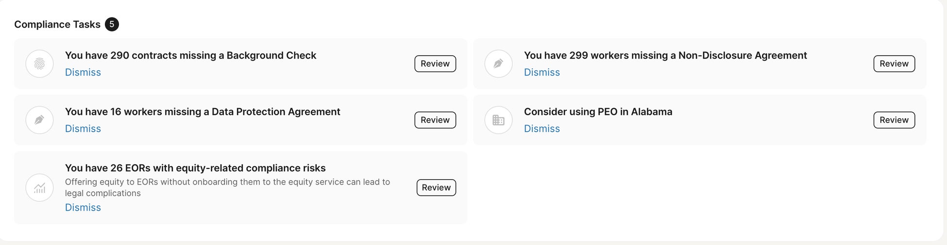 もしDeelのプラットフォームに従業員の人材情報をご入力いただきましたら、各国にいる従業員に紐付いた最新のコンプライアンス情報や確認必須事項などがCompliance Taskとして表示されます。