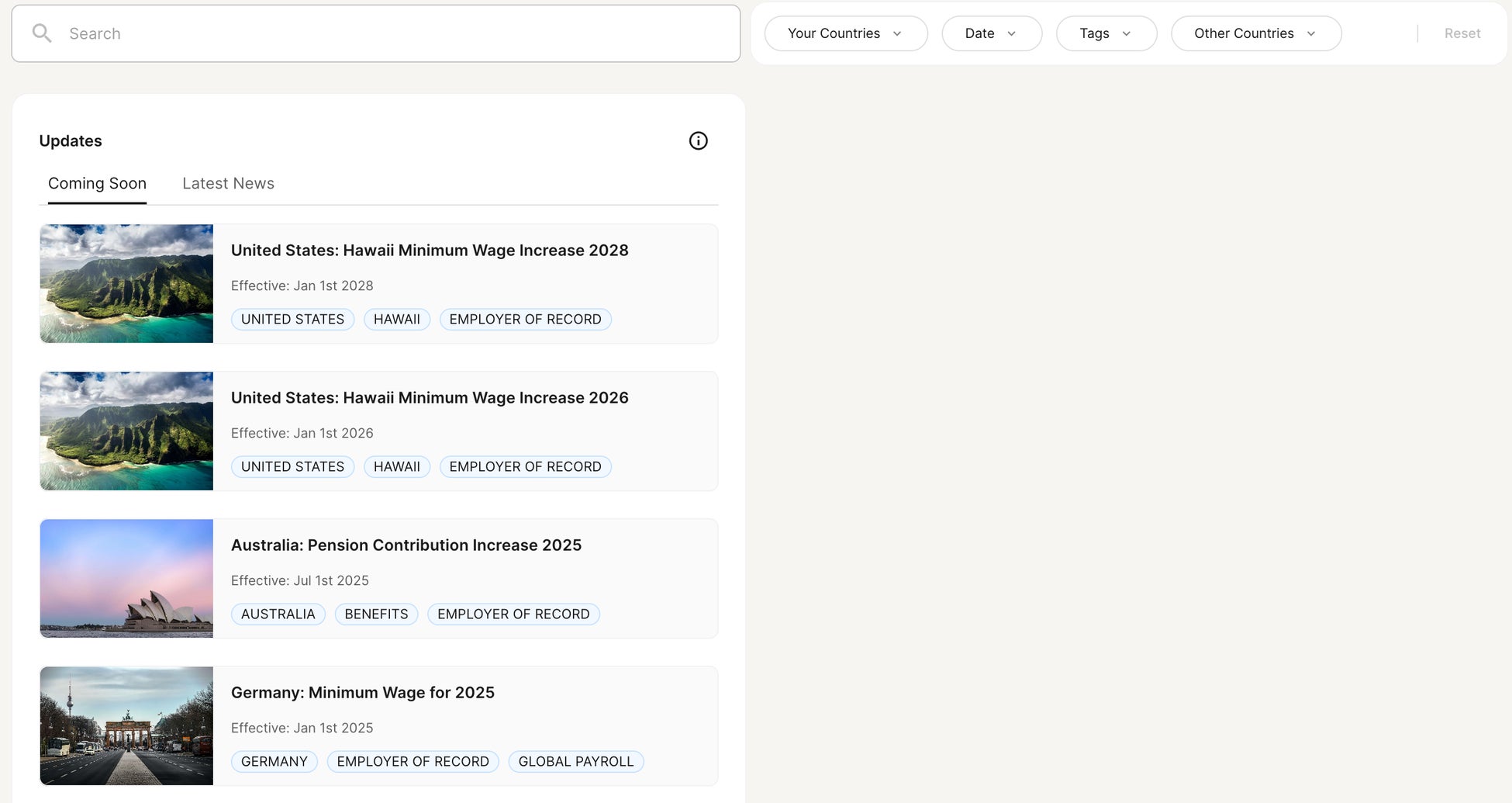 検索窓に雇用している/する人材の対象国や州についてや気になるキーワードを検索すると各国のアップデートされる労働法制が上がってきます。