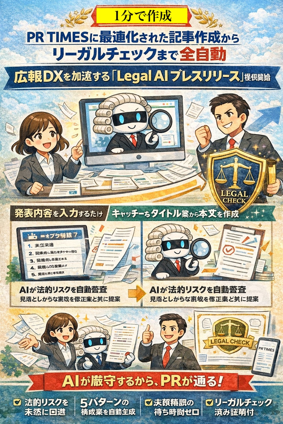 Legal AI 株式会社(本社:東京 代表取締役 渡部 薫)は、PR TIMESなどの配信プラットフォームに最適化されたプレスリリースを自動作成し、同時に法的リスクのリーガルチェックを行う新サービス「Legal AI プレスリリース」の提供を開始しました。