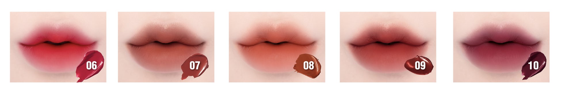 熟した果実をかじったようなディープカラーをまとえるマットティント。生クリームのようなふわふわとしたテクスチャーで、軽い付け心地。表面はしっかりマット、唇はしっとりと、乾燥が気になりにくい質感です。大人っぽさを演出できるクールカラーが揃った全10色展開。