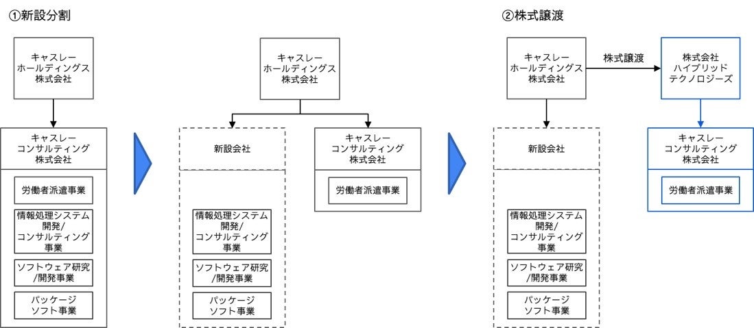 現時点の対象会社の100%株主であるキャスレーホールディングス株式会社は、今後株式譲渡実行日までの期間に新設会社を設立し、対象会社に残す労働者派遣事業(以下、対象事業と言う。)を除く全ての事業及び人員等を新設会社に移転いたします。その後、当社は、株式譲渡実行日にキャスレーホールディングス株式会社から対象会社の全発行済株式を取得し、当社の100%子会社化を実行いたします。