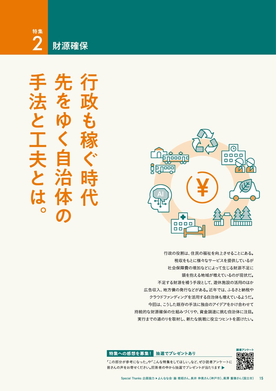 今号の特集1では、「[EBPM]まずは身近な事業から、易しくひもとくEBPM。」をテーマに、北海道芽室町、神奈川県葉山町、岡山県などの事例をご紹介しております。特集2では、「[財源確保]行政も稼ぐ時代、先をゆく自治体の手法と工夫とは。」をテーマに、山形県西川町、福岡県北九州市、茨城県つくば市などの取り組みをご紹介しております。