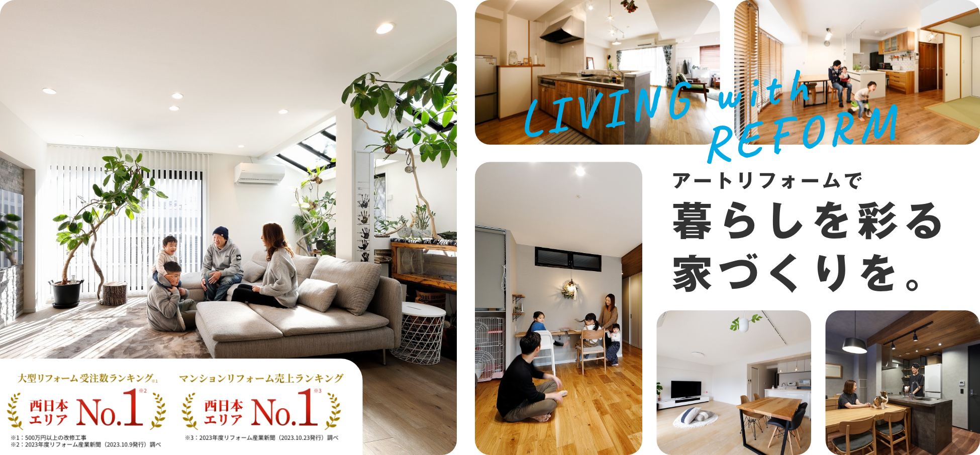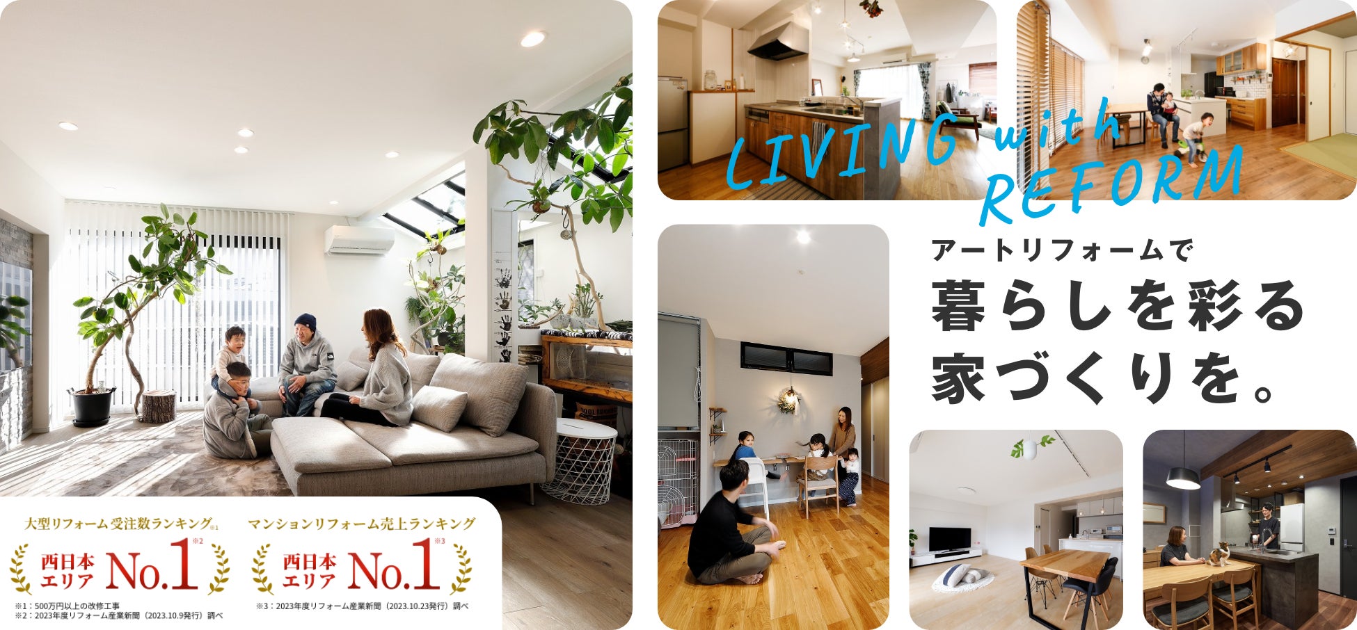 創業70年、年間6500件以上のリフォームを施工し、関東、関西、東海、九州に展開するアートリフォーム。大手不動産仲介会社各社のパートナーとなり、中古物件購入時のリフォームを手掛けるBtoB事業、WEBや折込チラシからの反響顧客に対するリフォーム提案のBtoC事業を展開。利用者数No.1のリフォーム会社サイト「ホームプロ」においては12年連続でリフォーム完了件数西日本第一位、2022年度は完了金額西日本第一位の表彰を受けている。また、2022年度の売上ランキングでは西日本の総合リフォーム店で1位となり、ビジョンである『業界の先頭集団』に向けて成長を続けている。
