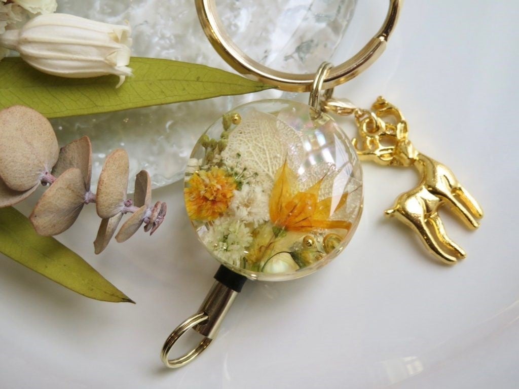 レジンの扱い方や作家だからお伝えできるワンポイントアドバイスを交えながら、丁寧にお教えします。リールキーホルダーは、先端部分のワイヤーが伸縮するキーホルダー。鞄に付けたまま鍵やパスケースが使える便利アイテムです。「あれ、どこいった?」が無くなりますよ。ぜひ一緒にオリジナルの作品を作りましょう♪(レジン製作体験です)