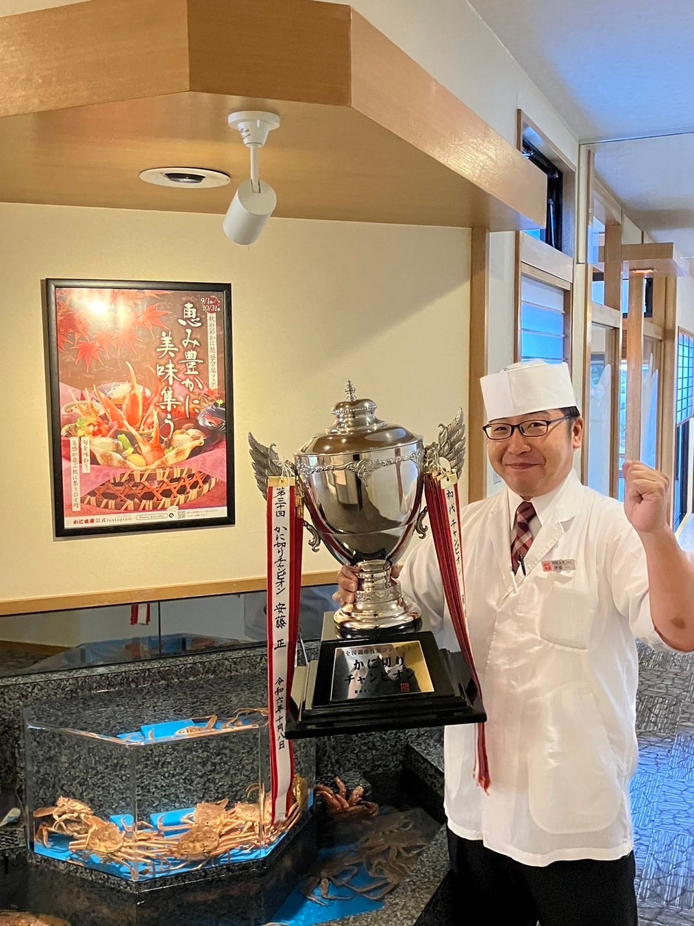 社内の仲間に叱咤激励してもらいながら勝ち取った「かに切りチャンピオンの称号」を