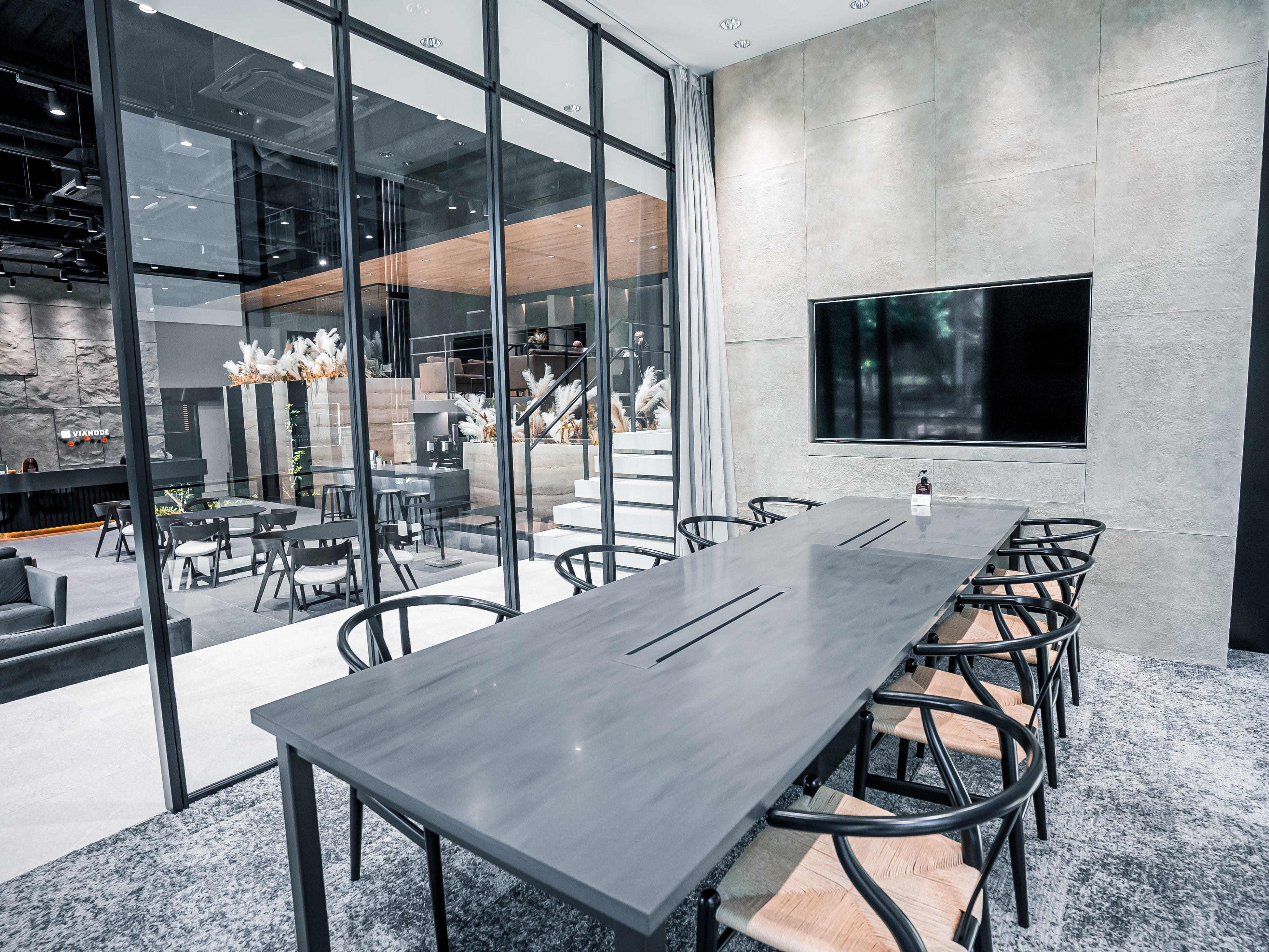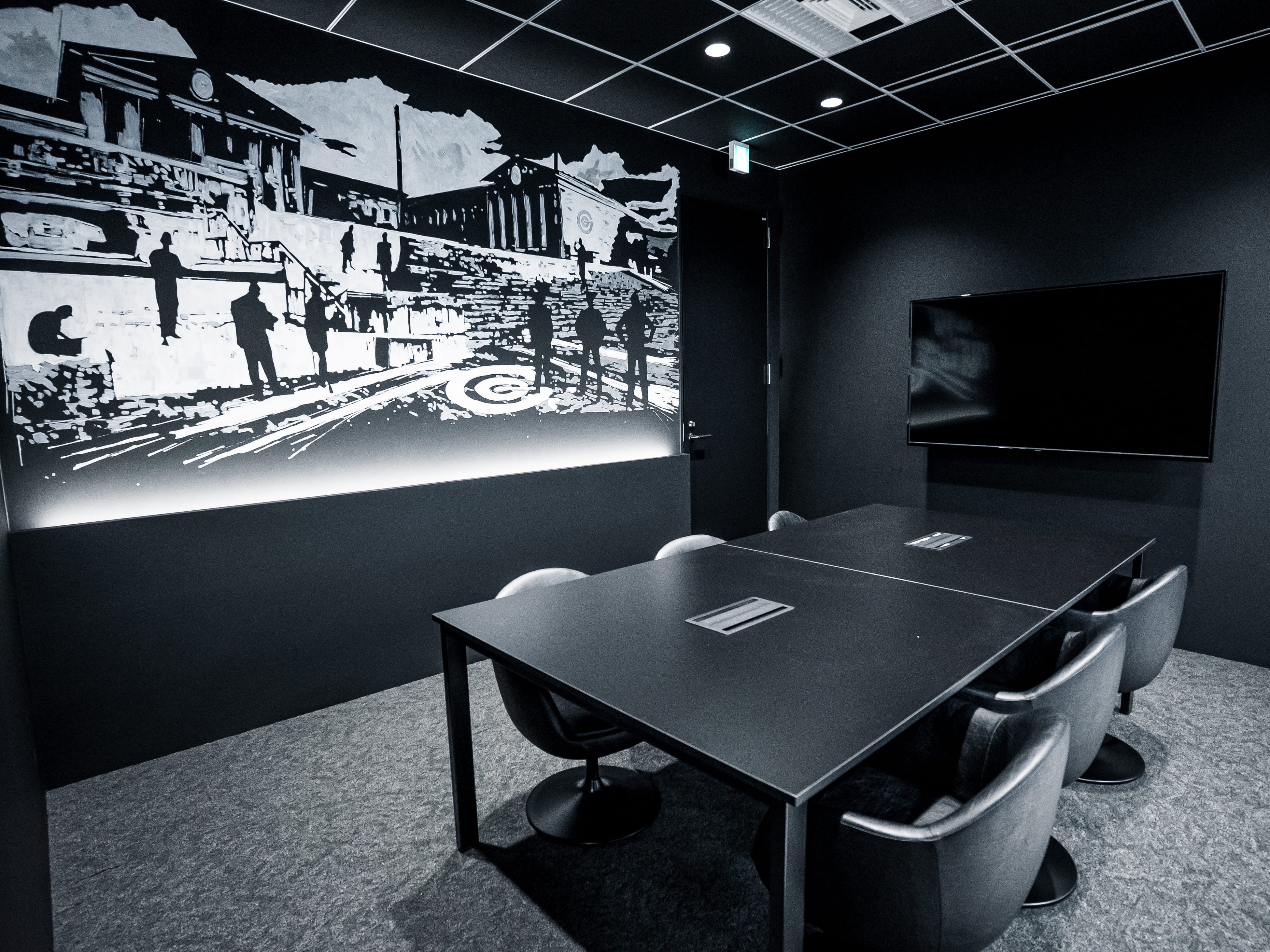 「余白」を大切に、ディスカッション中に気軽に席を立って考えたり、スクリーン近くに集まったりできるよう、開放感のあるミーティングスペースを作りました。