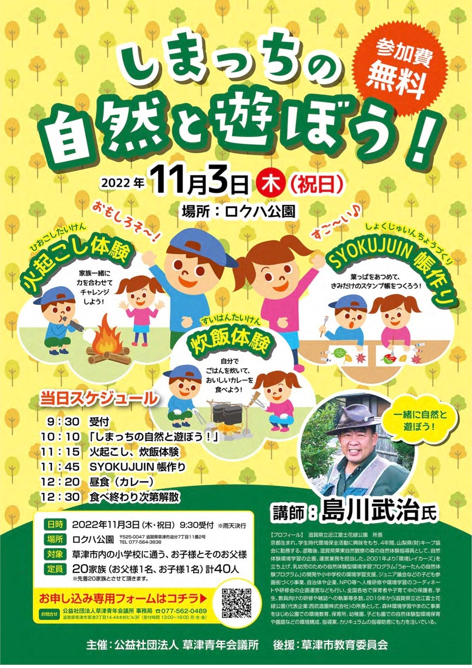 県立近江富士花緑公園所長の島川武治氏をお呼びし、自然の中で様々なことを体験して頂く内容と