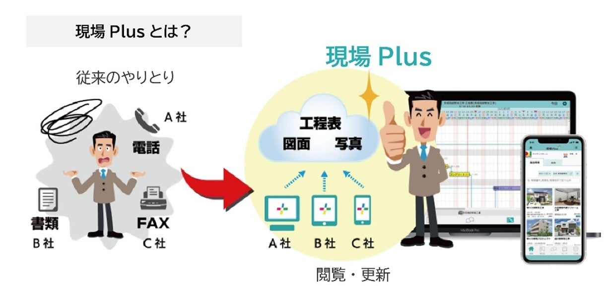 「現場Plus」は月額1万円(60ID)から利用できる建設現場の施工管理アプリで、2024年3月末時点で6万社以上の企業様にご利用いただいております。従来の電話、FAX、書類をクラウドに置き換えることで生産性を向上します。工程管理、図面管理、写真管理、コミュニケーションなどの基本機能に加え、入退場やKY活動、安全パトロールなど就業・安全管理まで標準サポート。大幅な業務効率化を実現できます。