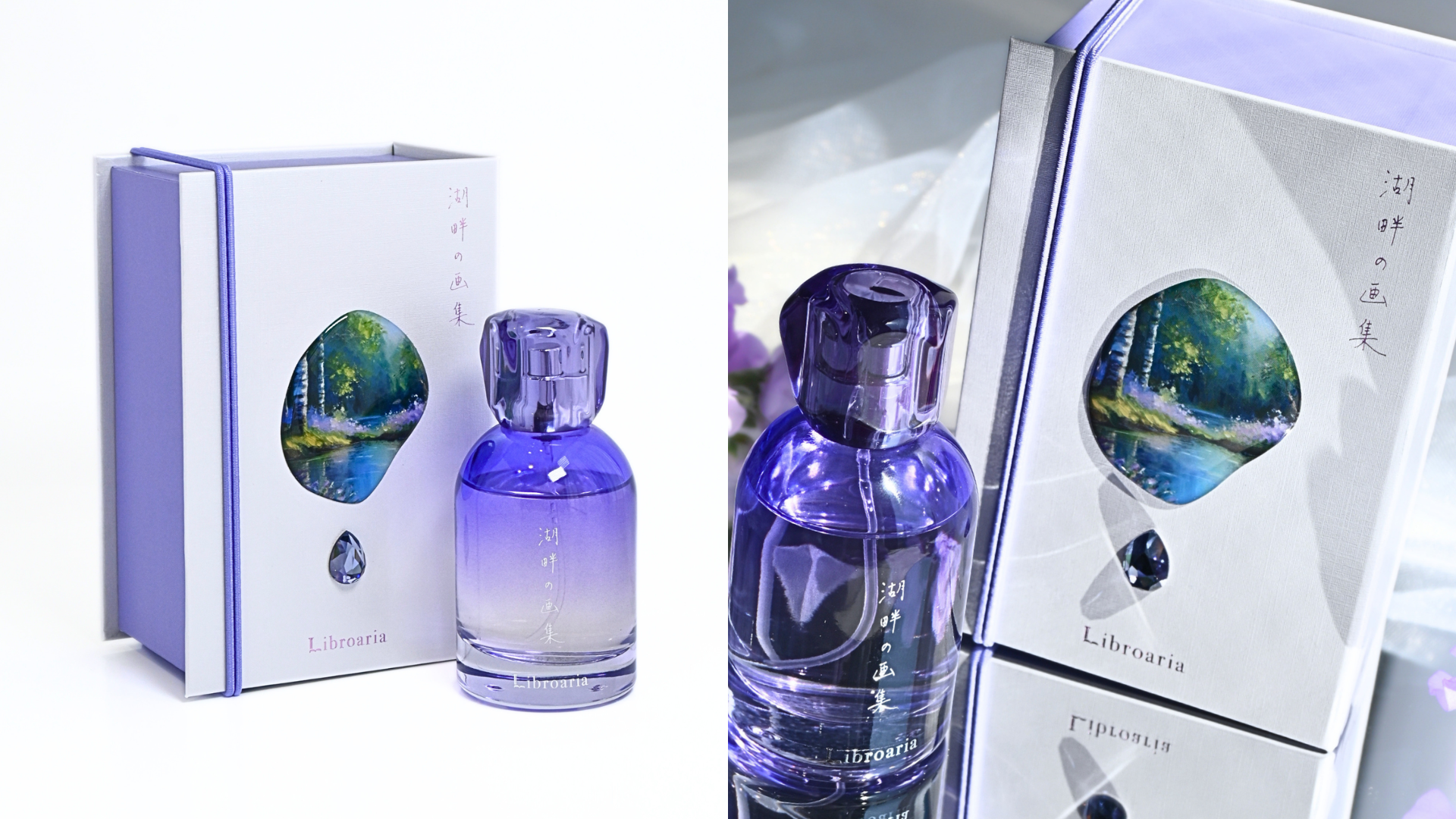 新パッケージは、水面に情景を映し取ったような立体的な装飾を施し、そこからこぼれ落ちた香りをイメージした一滴のきらめきをあしらいました。視覚的な美しさとともに、香りの世界観をより直感的に感じていただけるデザインとなっています。