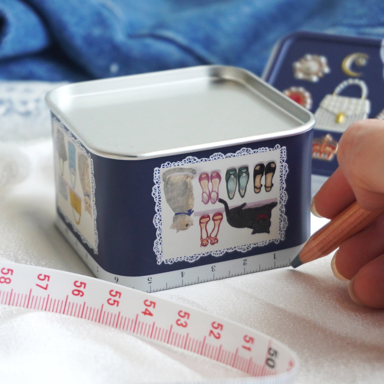 洋服を作る時に使うメジャーをイメージし、缶の蓋面で隠れる部分にメジャーのイラストをデザインしました。