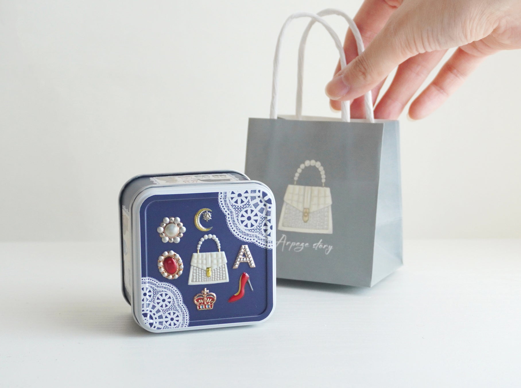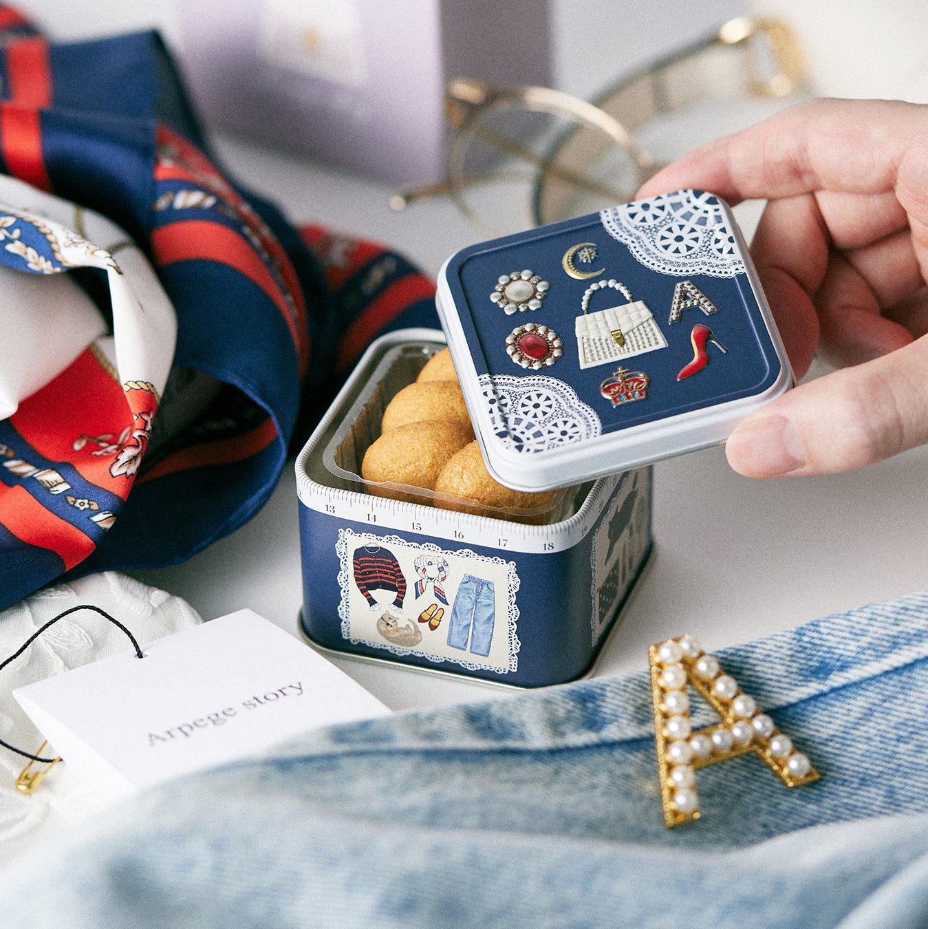 Arpege storyのアクセサリーやバッグ、洋服、靴などが缶の天面や側面にデザインされたお菓子缶。