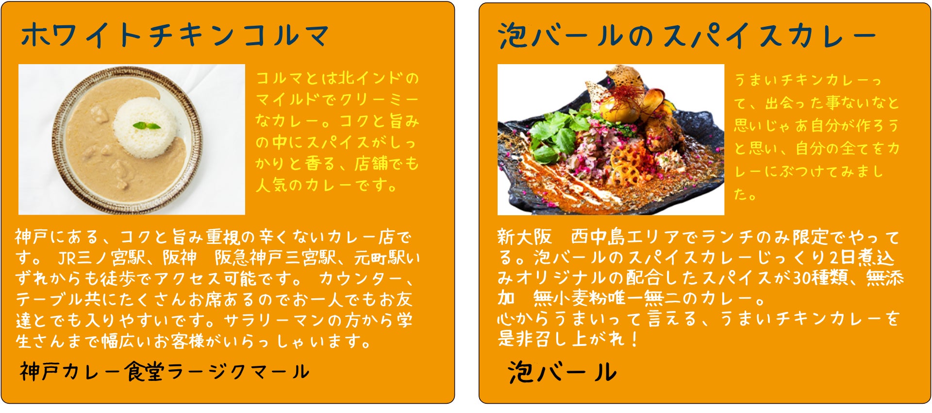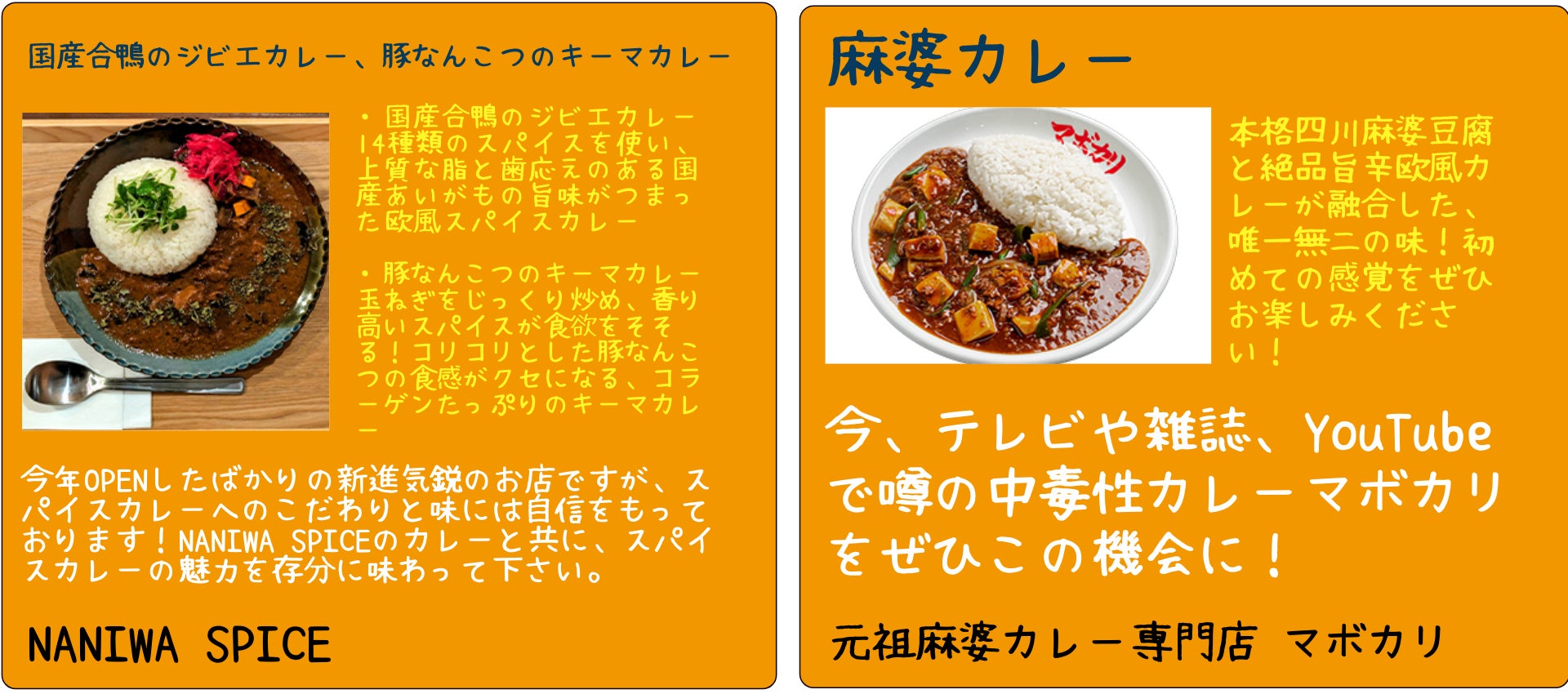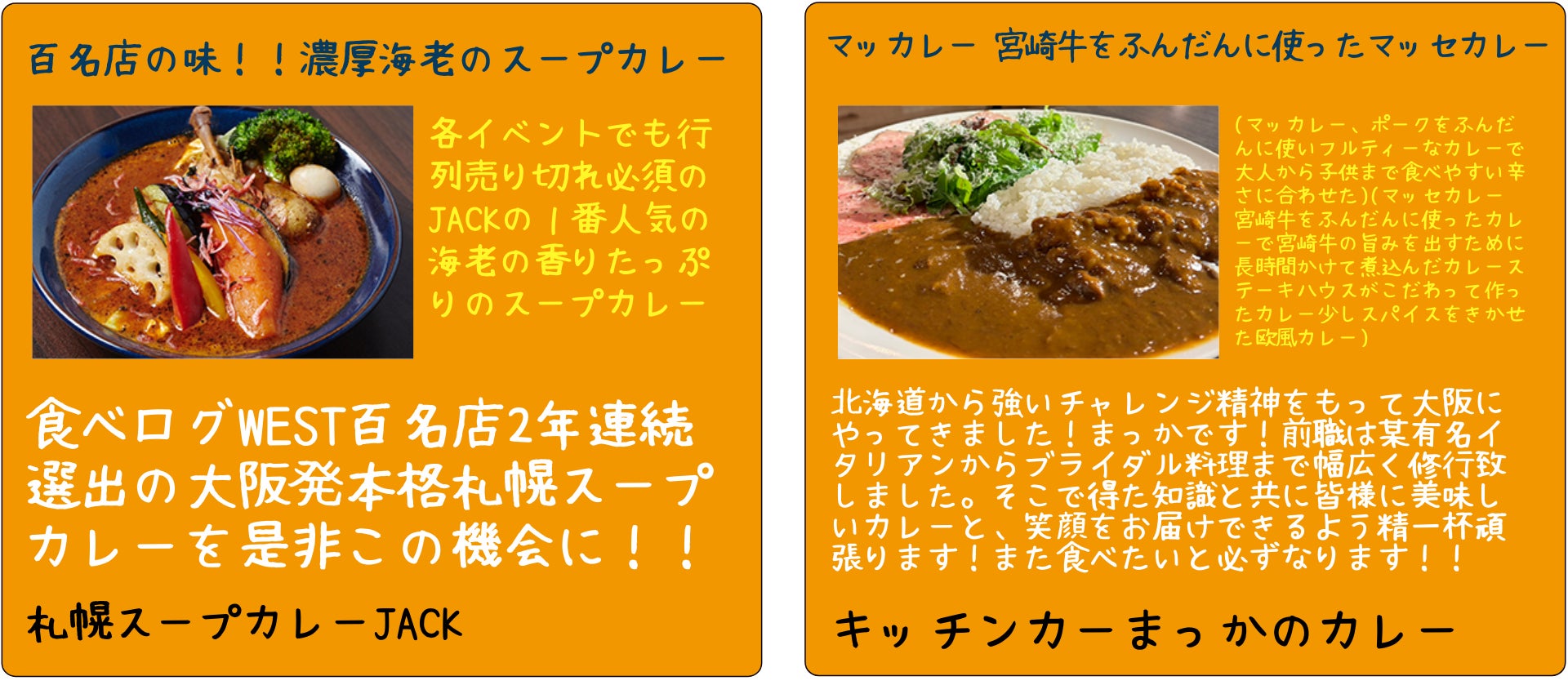 関西を中心にカレーの名店が集結!カレーといっても様々な種類があります。そんなカレーを食べ比べ!友人・家族とシェアするのもオススメです。またカレーNo1グランプリも開催!お気に入りのカレーを決めて投票しよう!