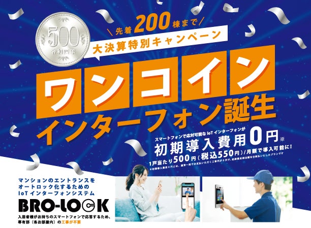 株式会社ブロードエンタープライズ(本社:大阪府大阪市、代表取締役:中西良祐、以下、ブロードエンタープライズ)は、IoTインターフォンシステム「BRO-LOCK」にて、先着200棟限定で1戸当たり月額500円(税込550円)で提供する「大決算特別キャンペーン」を開始したことをお知らせいたします。