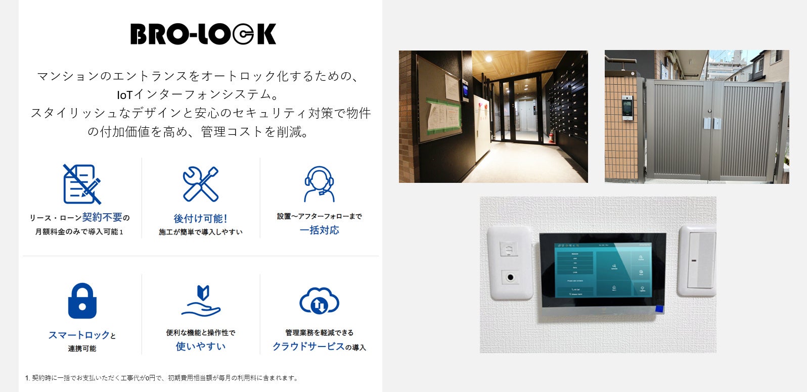 先着200棟限定で『BRO-LOCK』を1戸当たり月額500円(税込550円)、初期導入費用0円で提供。※初期導入費用0円とは、通常一括でお支払いただく工事代が0円で、初期費用相当額を分割払いにしたプランです。