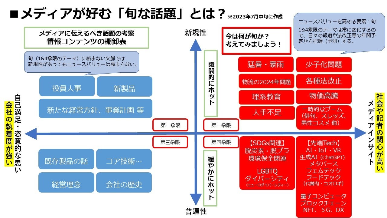 長沼 この方式に気付いていない企業が多いです。初心者の広報によくあるのは、メディア取材の時に売り込みたい話題をアピールするものの興味を持たれず。余談話が出てきた時に、「その話、面白いです」とメディア側に言われる。私も若い頃に経験がありました(笑)。