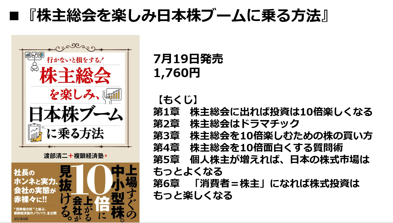 「先読み広報術1500人が学んだPRメソッド」を上梓した長沼史宏氏と「株主総会を楽しみ、日本株に乗る方法」を執筆した複眼経済塾・渡部清二塾長との10月11日発刊記念イベントのダイジェスト後編です。