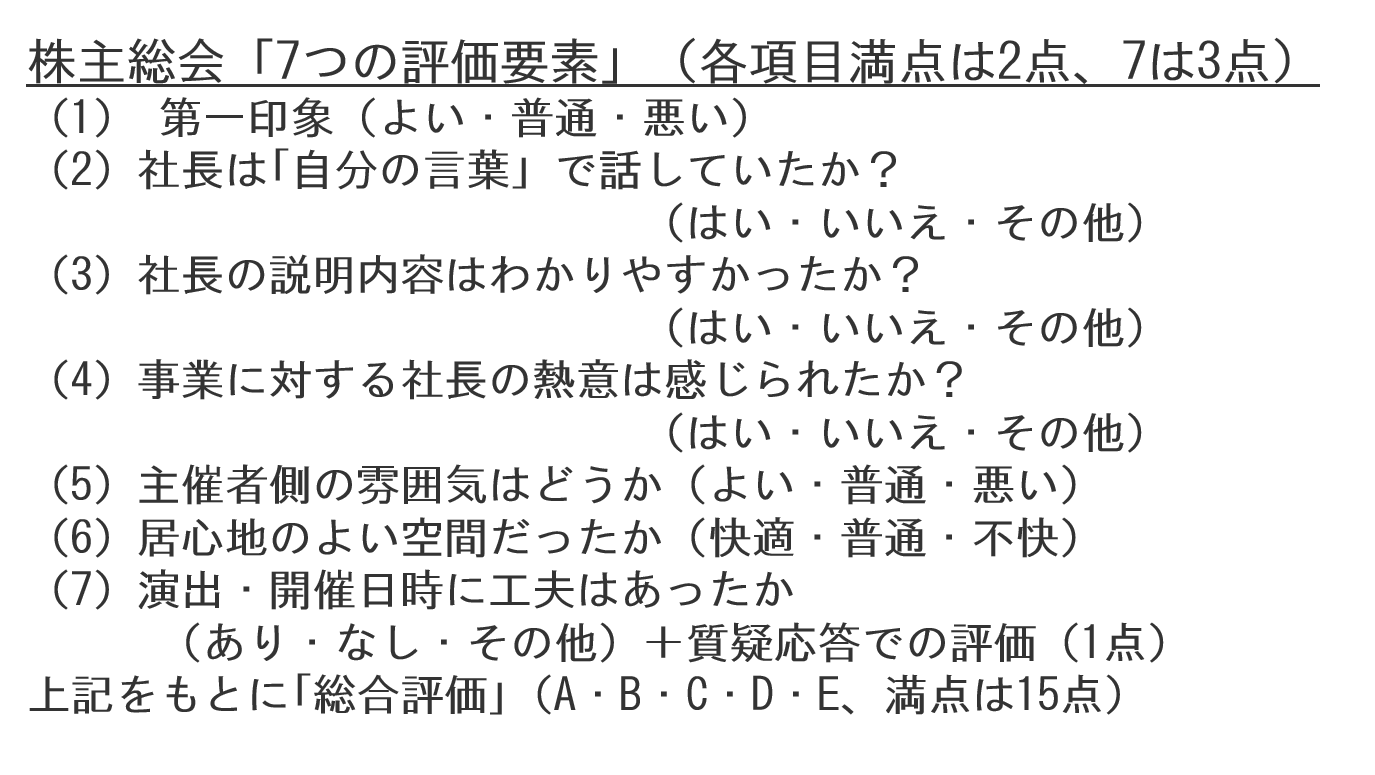 小笹 2点目は、「社長は自分の言葉で話をしていたか?」今まで存在した株主総会の本は、「べからず集」で、「何々をするのは駄目です」と書いてあるものばかりです。総会は年に1回しかなく、多くの社長は慣れないので、こうした本を鵜呑みしてしまいますが、出席者は、真実というか、企業の根っこを見たいのです。3点目は、「社長の説明内容は分かりやすかったか?」。これは、先程の2点目と似ているかもしれません。