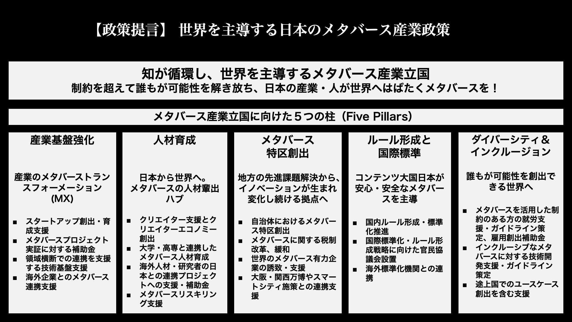 政府提言においては、知識の循環や制約を超えた創造力を重視し、この政策提言は、以下の5つの柱(Five Pillars)を掲げて展開されます。