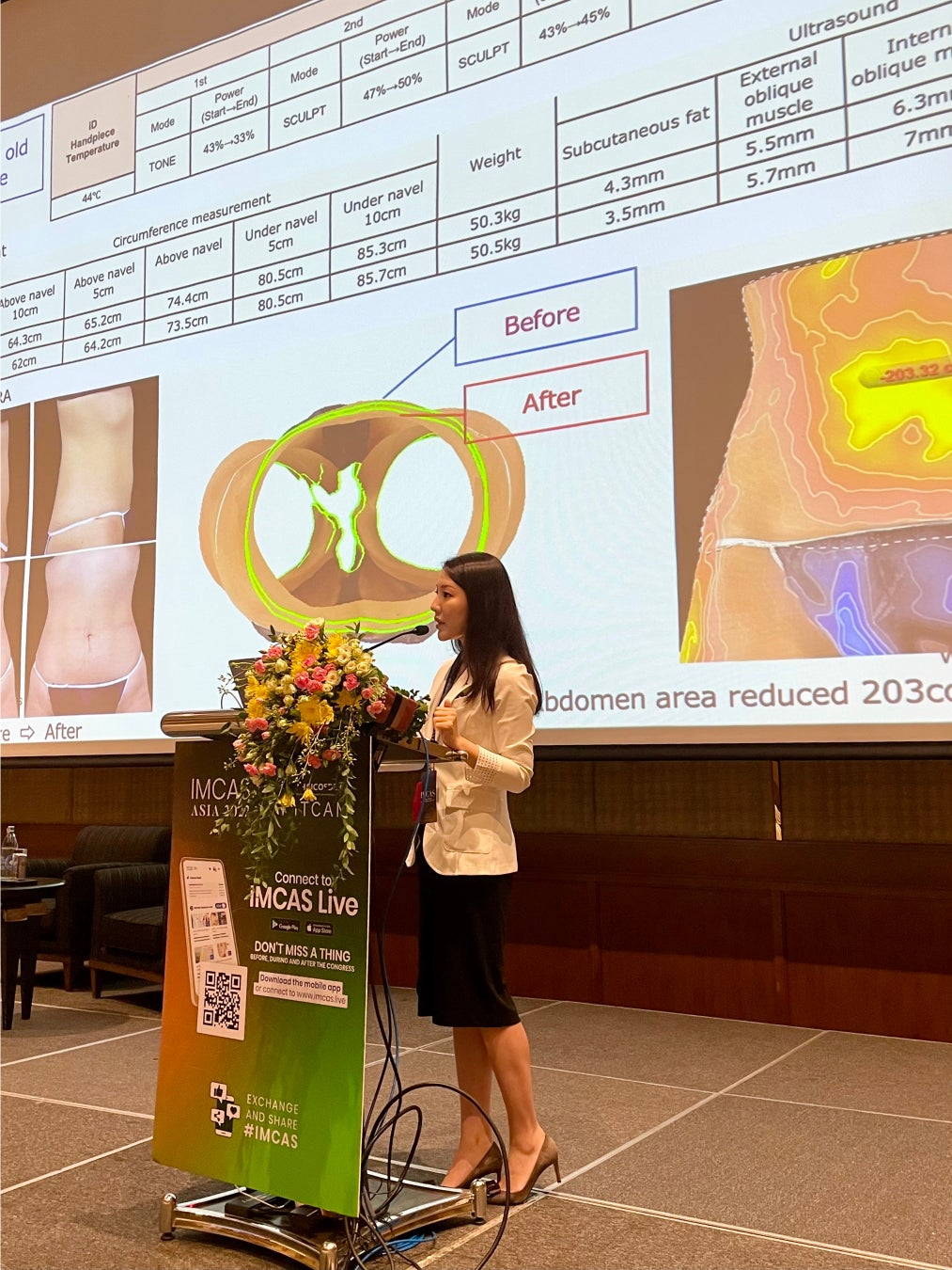 今回は30例の症例に対して、何ら運動や食事習慣の介入を行わず、機器治療単体で検討。腹囲測定、写真評価、超音波検査による皮下脂肪や筋肉の厚み測定、3D画像解析によるボリューム評価した結果を発表しました。