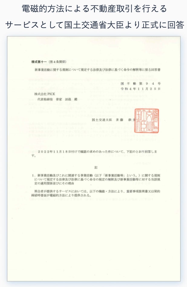 国交省のマニュアルに沿って運用できていない場合、宅建業法違反になる可能性もありますが、PICKFORMは、宅地建物取引業法に適法に対応されていることが担保された状態で、宅建業者様が電磁的方法による不動産取引を行えるサービスのため、その安心感を評価いただきました。