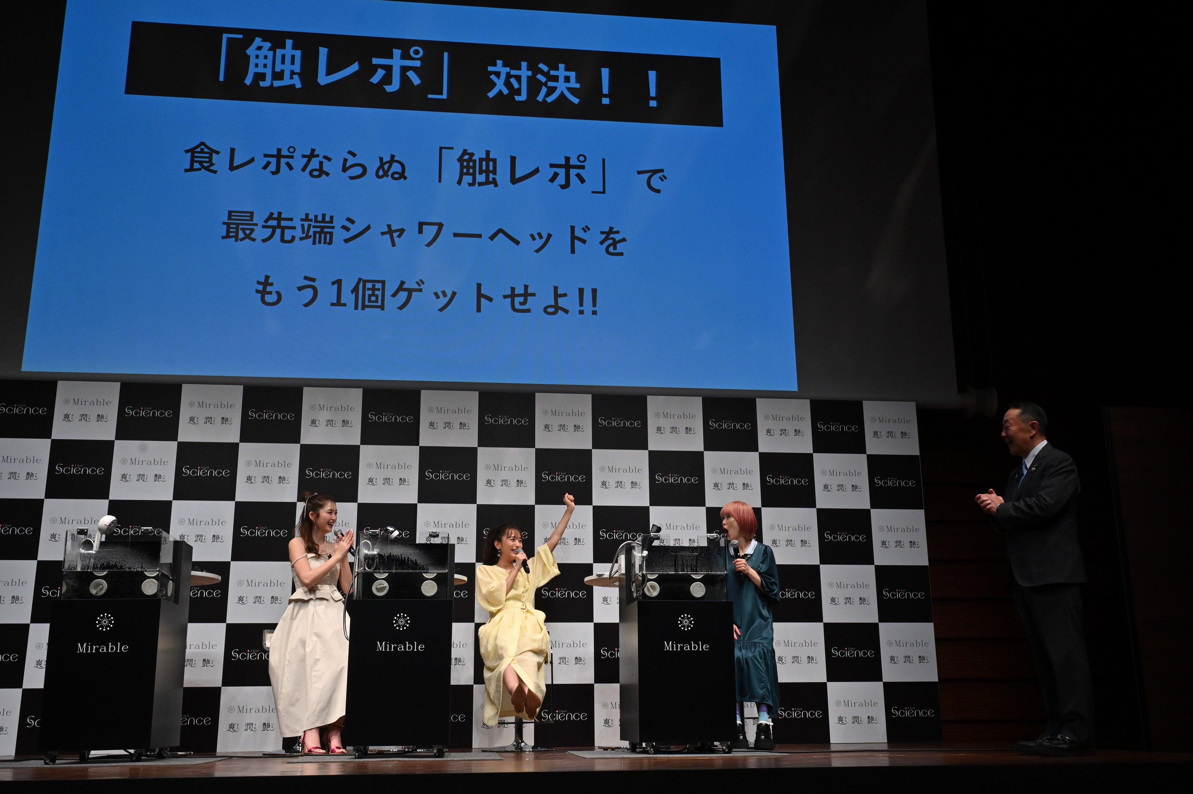 今回ゲストの皆さんには、「ミラブルエイジングシリーズ」の水流の特徴を食レポならぬ「触レポ」という形で、15秒間で表現していただきました。