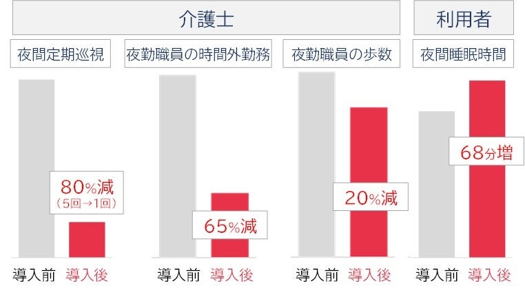 発売に先立ち、NEZAMELを全床に導入した介護施設で効果検証を実施したところ、定期巡視を含めた訪室回数を減らすことができ、夜間の介護士の動きが効率化されました。また、訪室回数が減ったことで利用者の睡眠時間確保にも寄与することが確認できました。