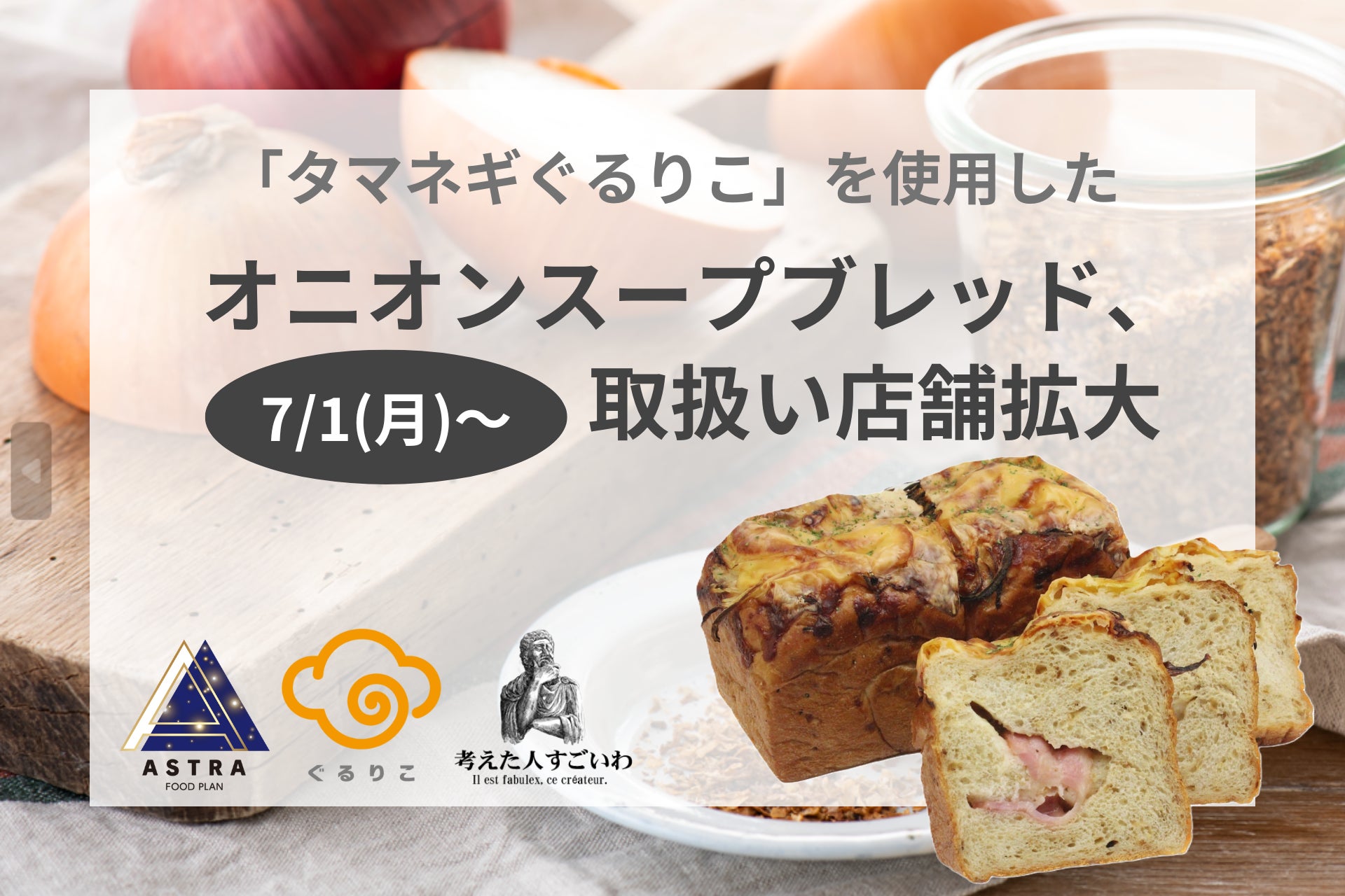 「サスティナブルな社会の実現」をミッションに掲げるフードテックベンチャーのASTRA FOOD PLAN 株式会社(埼玉県富士見市、代表取締役社長:加納 千裕 以下ASTRA FOOD PLAN)は、2024年7月1日から、『タマネギぐるりこ』を使った「オニオンスープブレッド」が高級食パン専門店「考えた人すごいわ」で店舗を拡大して販売開始されることをお知らせします。「オニオンスープブレッド」は、2024年5月1日から清瀬店のみで1日20本限定で販売されていましたが、売れ行きが好評だったことや、「考えた人すごいわ」を運営するオーネスティグループが、ASTRA FOOD PLANが目指す循環型の社会に共感し、『ぐるりこ®』を世に広めたいという思いから、販売拡大に至りました。