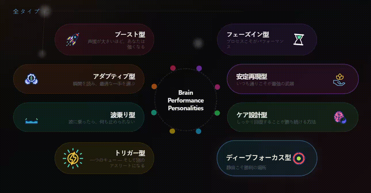 ブレインパフォーマンスパーソナリティは、これまでニューラルポートが提供してきたVR脳疲労測定システム「ZEN EYE Pro」の活用現場の声と、確かな現場蓄積データから生まれました。脳疲労計測データを提供していく中で、脳疲労の度合いや測定シチュエーション(試合前後など)に加え、「その人のにはどんな脳の特性があるのか」に向き合う必要がありました。よりデータの解釈を拡張するため、蓄積した視線データとAIによるタイプ分類モデルを掛け合わせ、脳の"個性"を可視化する本サービスが誕生しました。