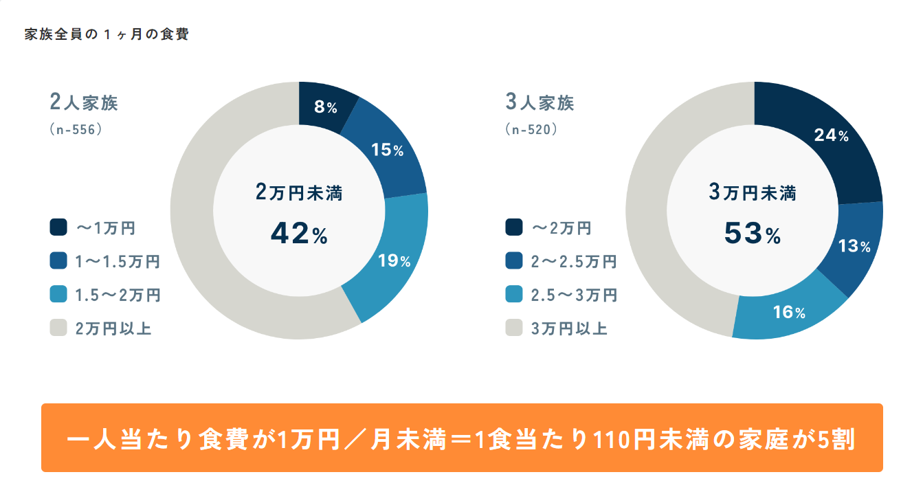 本年6月にキッズドア実施した調査では、調査対象の困窮子育て家庭の約5割で、一人当たりの1か月の食費が1万円未満と大変低いことがわかりました。