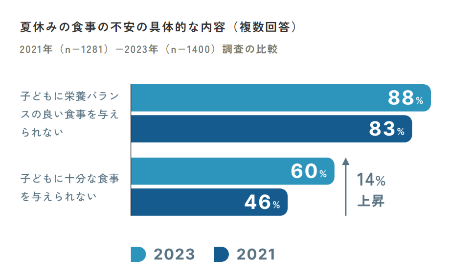 同調査で、夏休みに子供に十分な食を与えられないと考える保護者は6割に達し、コロナ禍の2021年度に実施した調査と比較しても大きく増加しています。