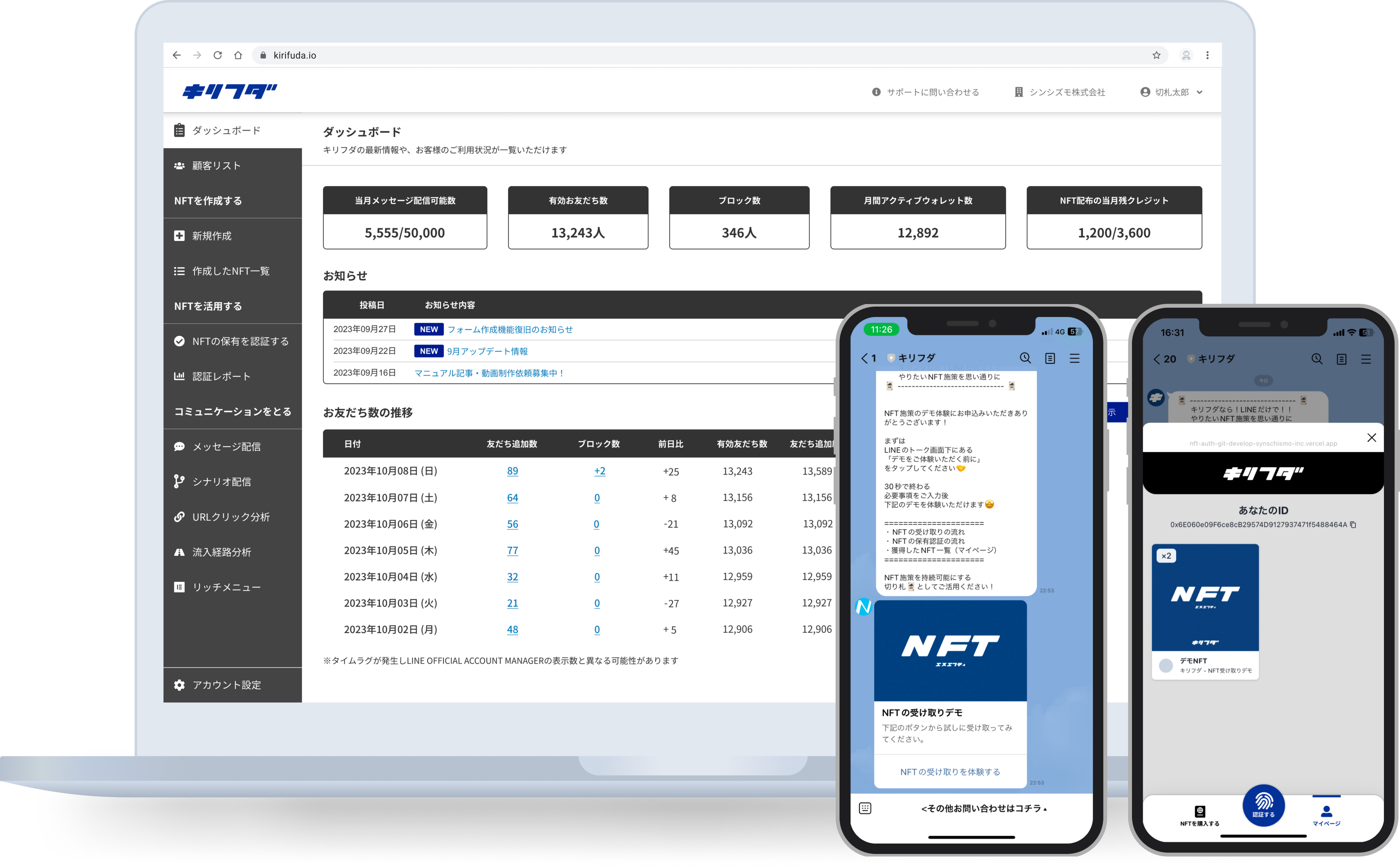 The NFT Lucky Bag initiative uses "Kirifuda," a service by Synschismo that completes the user experience related to NFTs on LINE. Kirifuda offers various use cases for NFTs from event participation proof to tickets, provided as a white label service for companies, becoming a trump card for corporate NFT utilization.